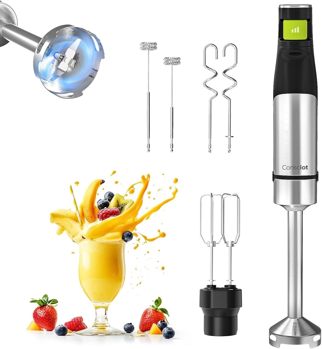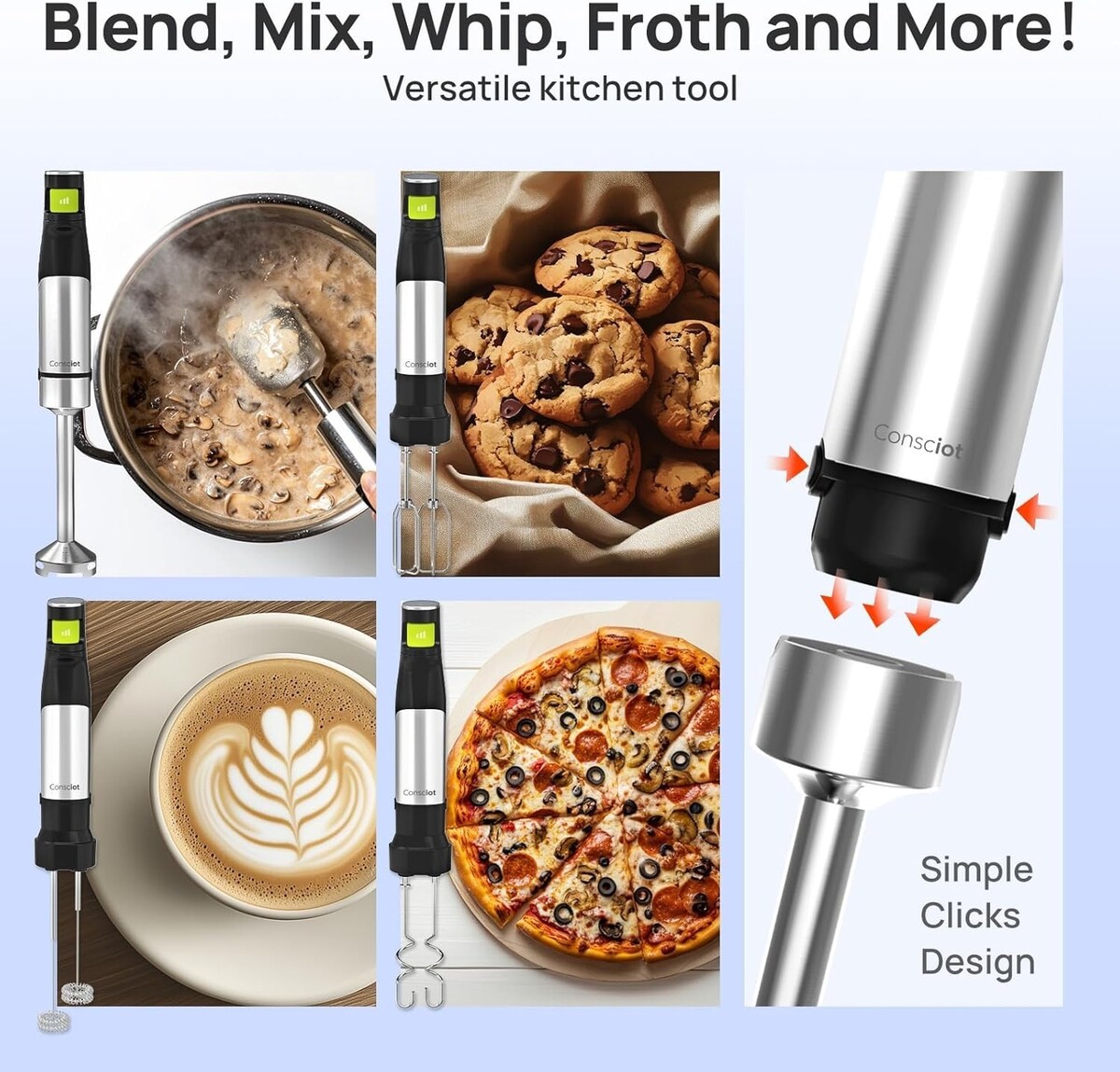 All-in-One Kitchen Aid: Perfect for blending, frothing, whipping, mixing, pureeing, and emulsifying a range of foods, from smoothies and soups to doughs and sauces.