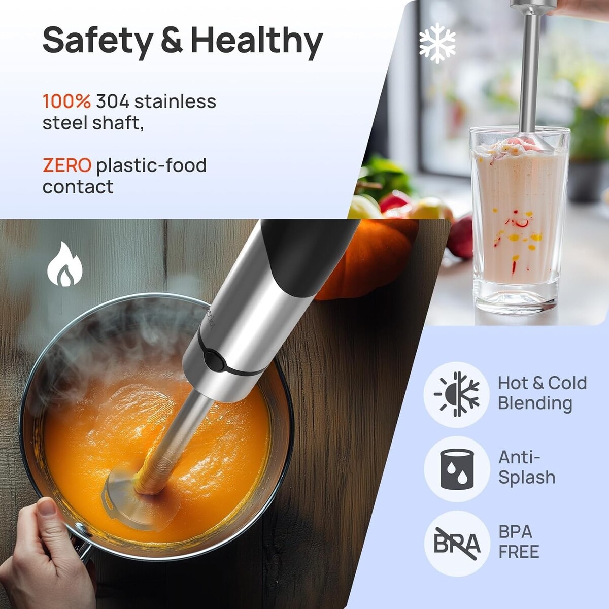 304 Food-Grade Stainless Steel: The entire blender shaft is constructed from durable stainless steel, ensuring zero contact with plastics, making it safe for both hot and cold blending.