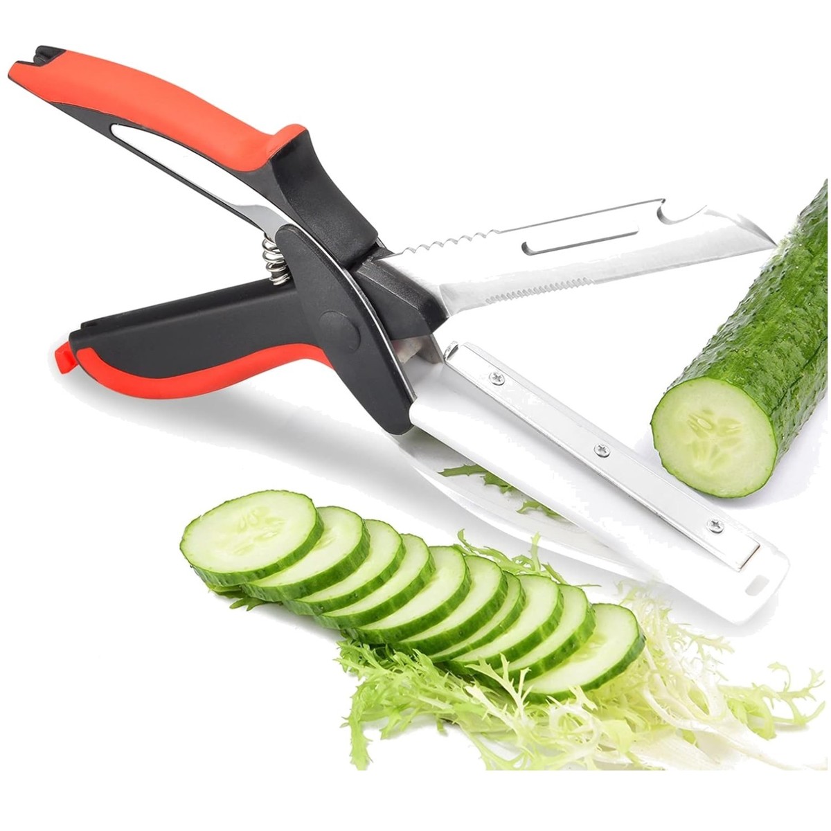 Designed for versatility: salad scissors, food chopper, fruit and vegetable chopper, lettuce chopper, and hand chopper.