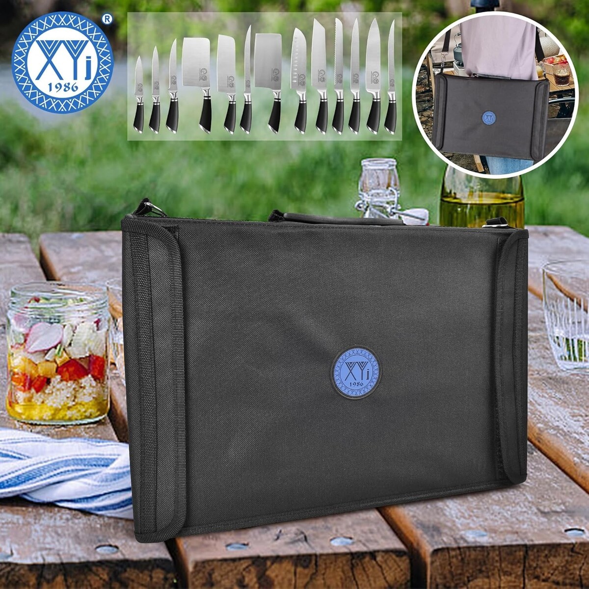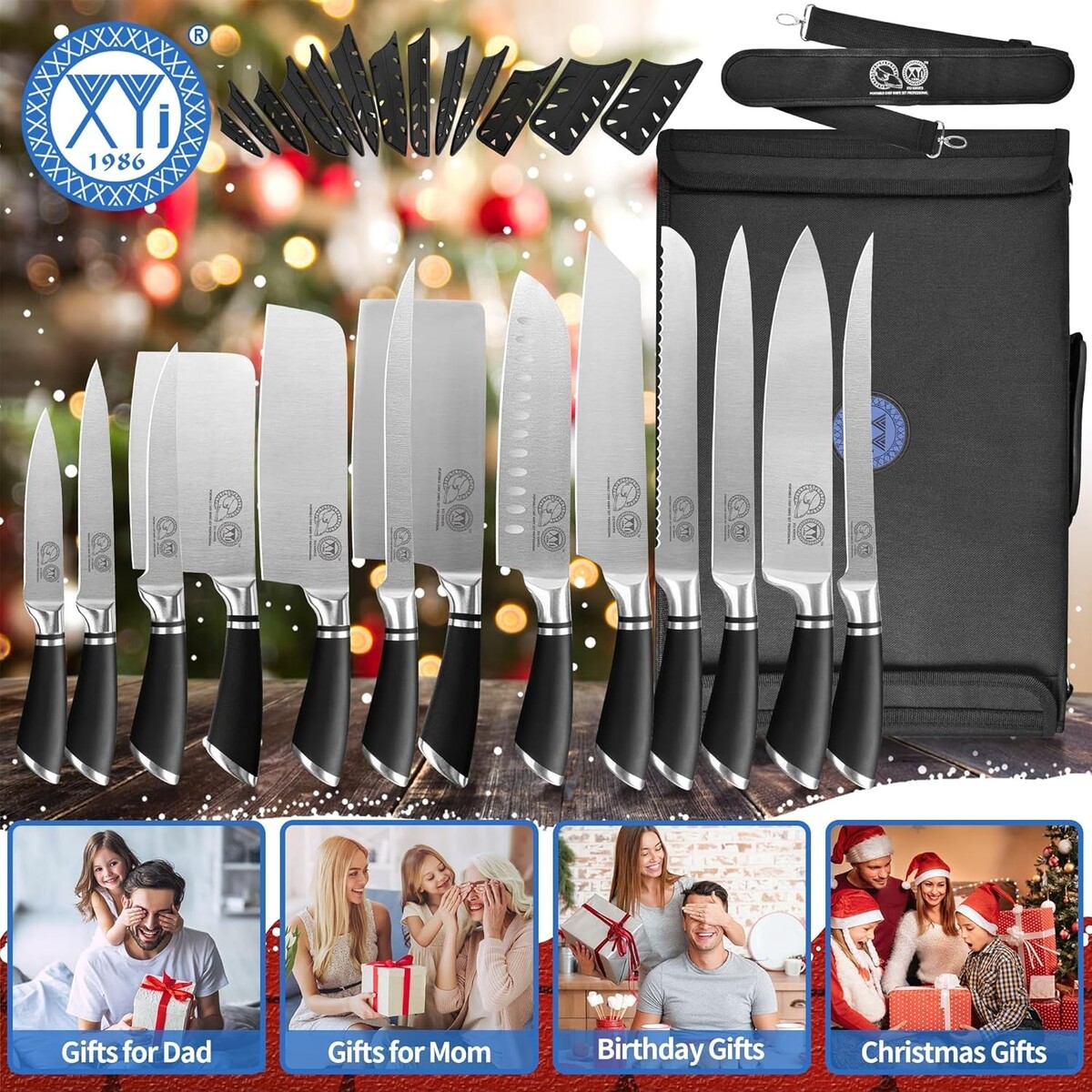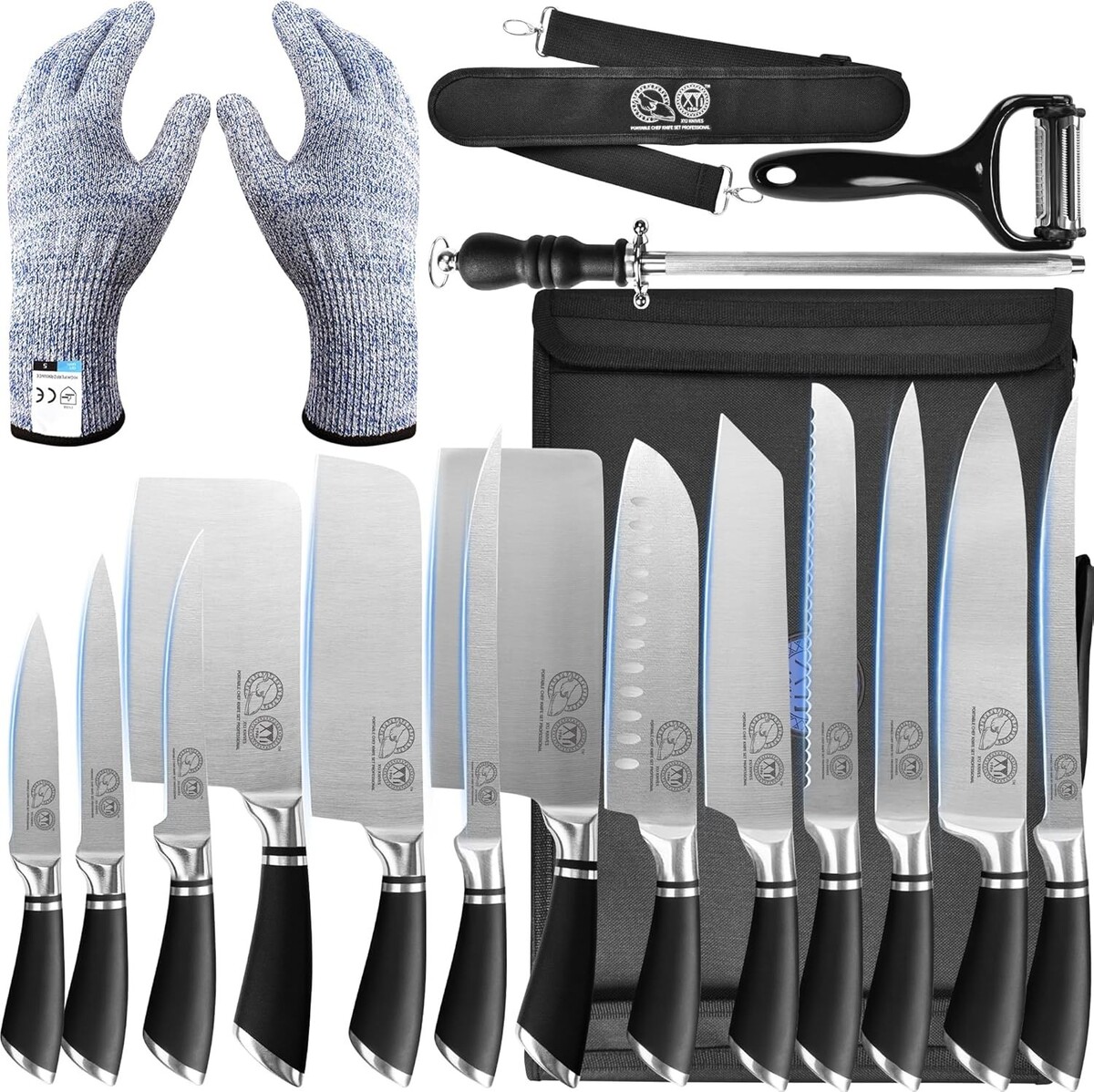 Set Includes: Knife Set,3.5 inch paring knife,5 inch utility knife,6/7/8 inch boning knife,6 inch chopping knife,6.5 inch nakiri knife,6.5 inch vegetable knife,7 inch santoku knife,8 inch cooking knife,8 inch slicing knife,8 inch bread knife,8 inch chef knife,13 pockets roll bag