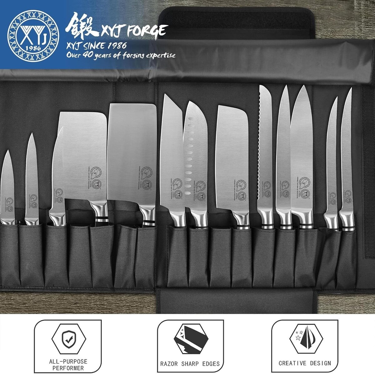 Includes a comprehensive collection of knives: 3.5-inch paring knife, 5-inch utility knife, 6/7/8-inch boning knives, 6-inch chopping knife, 6.5-inch nakiri knife, 6.5-inch vegetable knife, 7-inch santoku knife, 8-inch cooking knife, 8-inch slicing knife, 8-inch bread knife, 8-inch chef knife, and a 13 pockets roll bag.