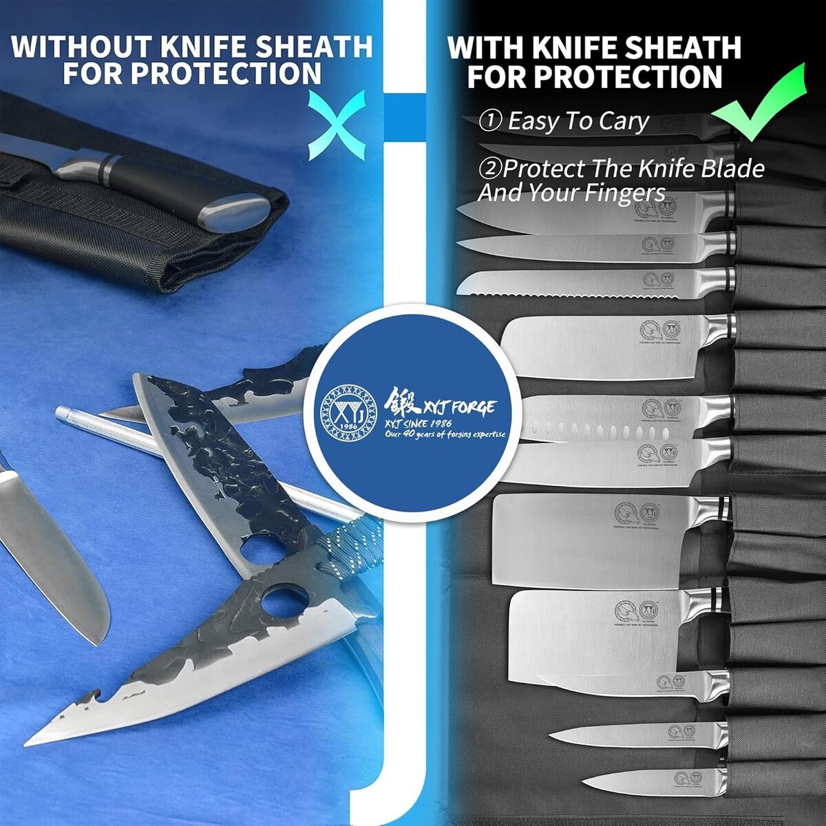 This cooking knife set comes with a sharpener rod, vegetable slicer, roll chef knife bag, and knife sheath for blade protection.