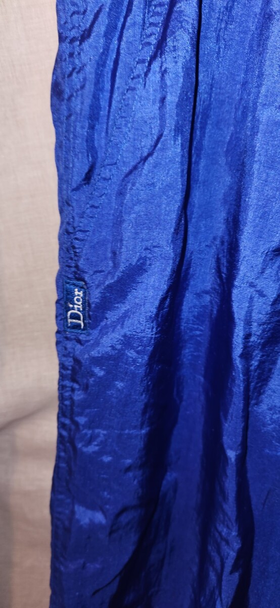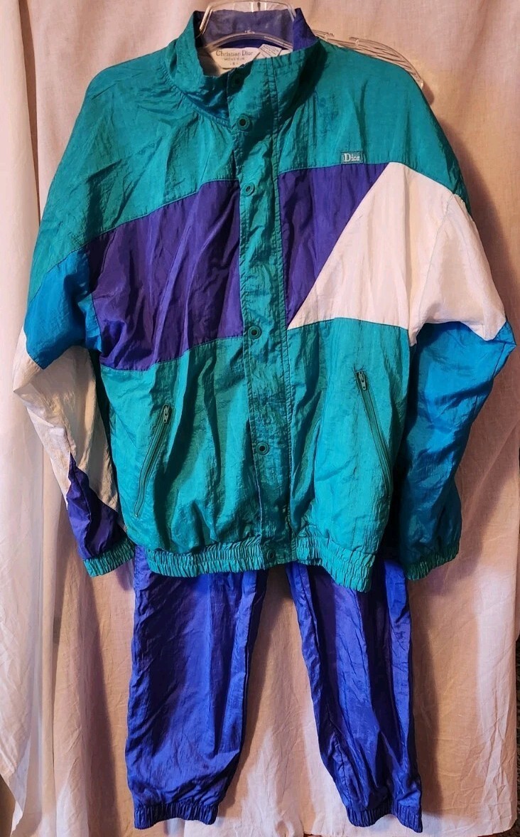 Nice vintage track suit. Dior. Monsieur. Jacket Size small. Pants are a medium. Nylon set. Jacket measures. approx 24 inches pit to pit. Shoulder to bottom is 27 inches. Zipper works as it should. Has buttons snaps over the zipper. Pants have draw string and light elastic. 15 inches laying flat at waist. Minimal stretch. Inseam is 30 inches. Set is in good condition. No tears or rips or other issues noticed. Classic Set.