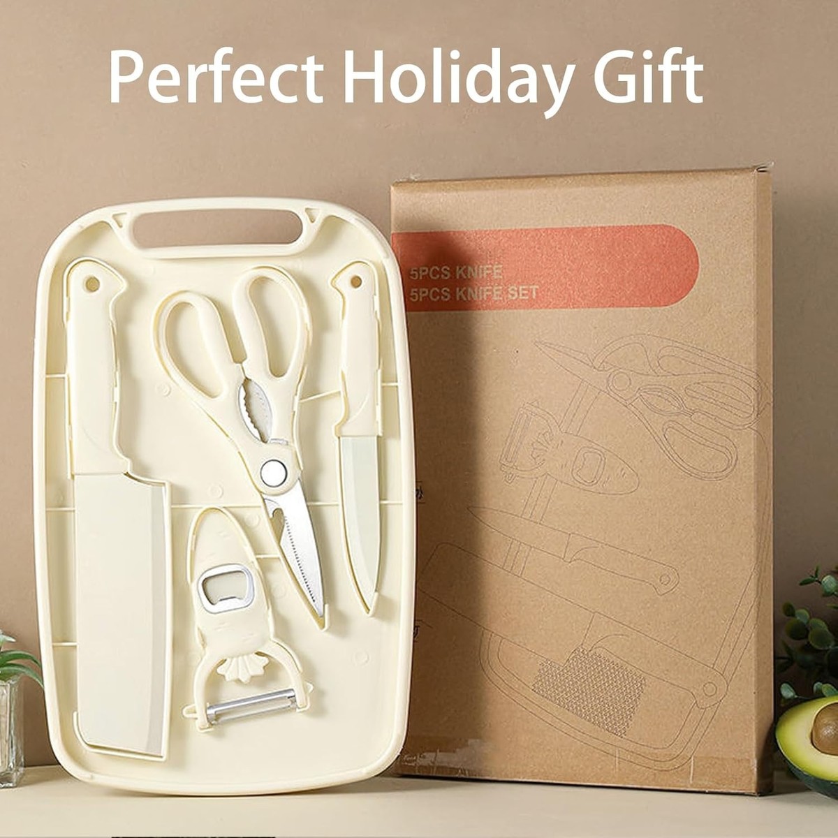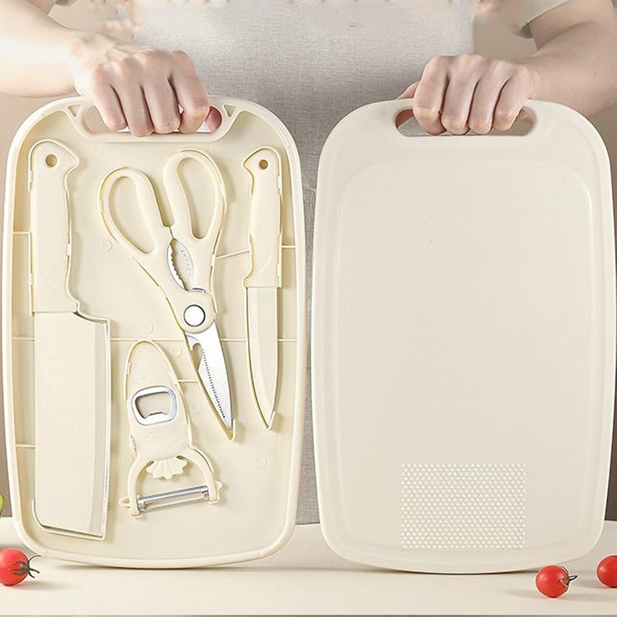 Includes all essential tools: a chef knife, a paring knife, a peeler, and scissors, all cleverly concealed behind the cutting board for space-saving convenience.