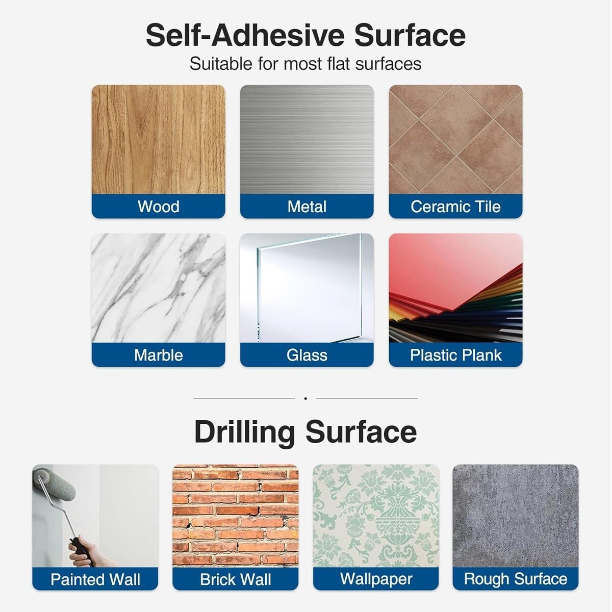 Two installation methods: Self-adhesive for easy mounting or drilled for extra stability.