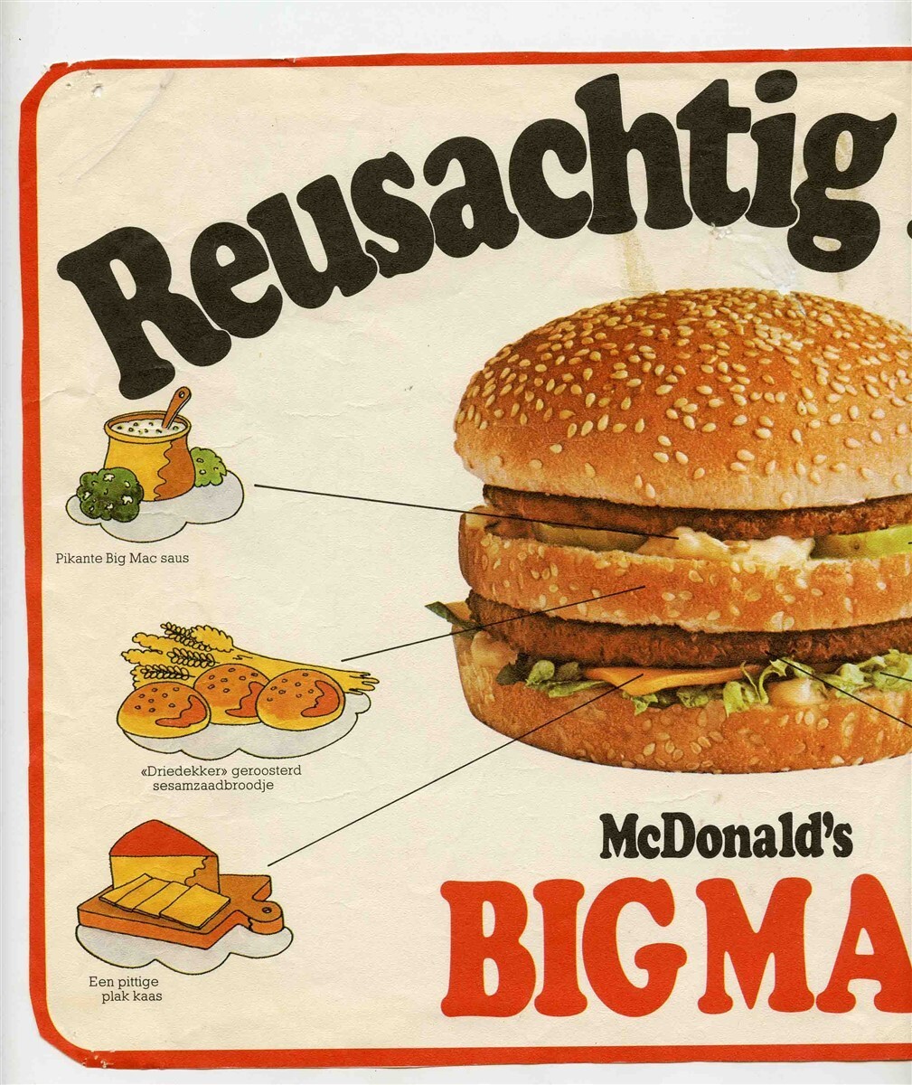 A paper placemat from a McDonald's Restaurant in Germany. McDonald's Big Mac Picture Placemat in German. Reusachtig Lekker. Has rounded corners.