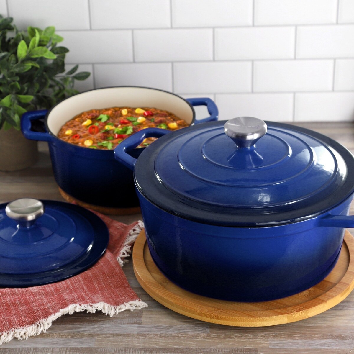 stews, chili, pot roast, and casseroles, this round enameled cast iron