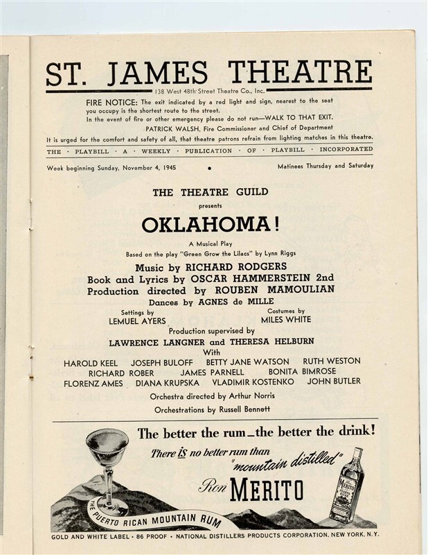 From the St James Theatre in New York City during September 1945. A Playbill from Oklahoma ,,