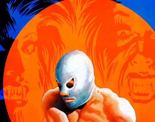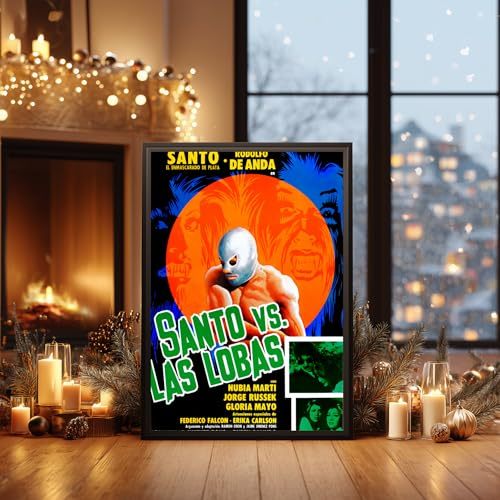 Product description: Step back in time with this stunning vintage Mexican wrestling movie poster print featuring the legendary El Santo in 'Santo vs Las Lobas'. This vibrant wall art captures the golden age of Lucha Libre cinema, showcasing El Santo, the iconic masked wrestler known as 'El Enmascarado de Plata' (The Silver Masked One). The dramatic poster design features a striking orange backdrop with Santo's powerful figure in his signature silver mask, while mysterious faces loom in the background. This artistic reproduction maintains all the dynamic energy and retro charm of the original theatrical release. Perfect for fans of classic Mexican cinema, wrestling enthusiasts, or anyone looking to add a bold, conversation-starting piece to their wall decor. This high-quality print is proudly made in the USA, ensuring excellent color reproduction and detail that brings this piece of wrestling history to life in your space.