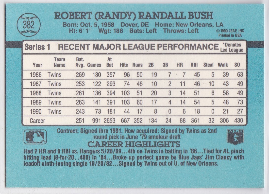 M) 1991 Donruss Baseball Trading Card - Randy Bush #382