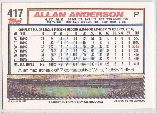 M) 1992 Topps Baseball Trading Card - Allan Anderson #417