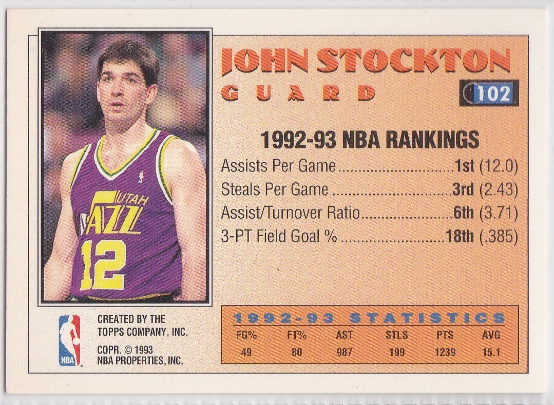 G) 1993-94 Topps Basketball Trading Card - All Star - John Stockton #102