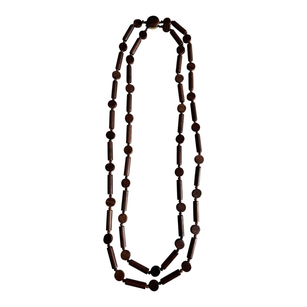 Vintage statement necklace featuring alternating round and barrel-shaped wooden beads in rich brown tones with a decorative center clasp accent. Lightweight yet bold, this natural wood piece adds earthy texture and retro character to any outfit.
