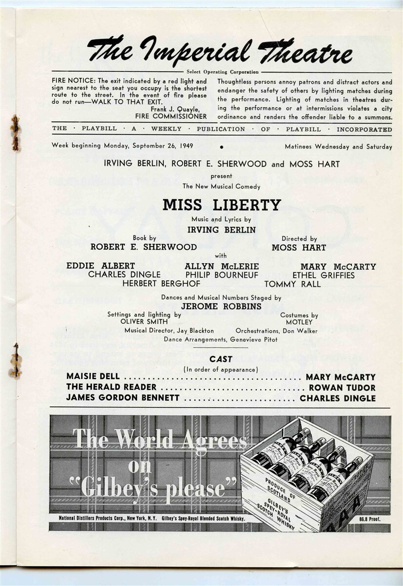 From the Imperial Theatre in New York City in 1949. A Playbill from Miss Liberty. Starring . Eddie Albert, Allyn McLerie and Mary McCarty .