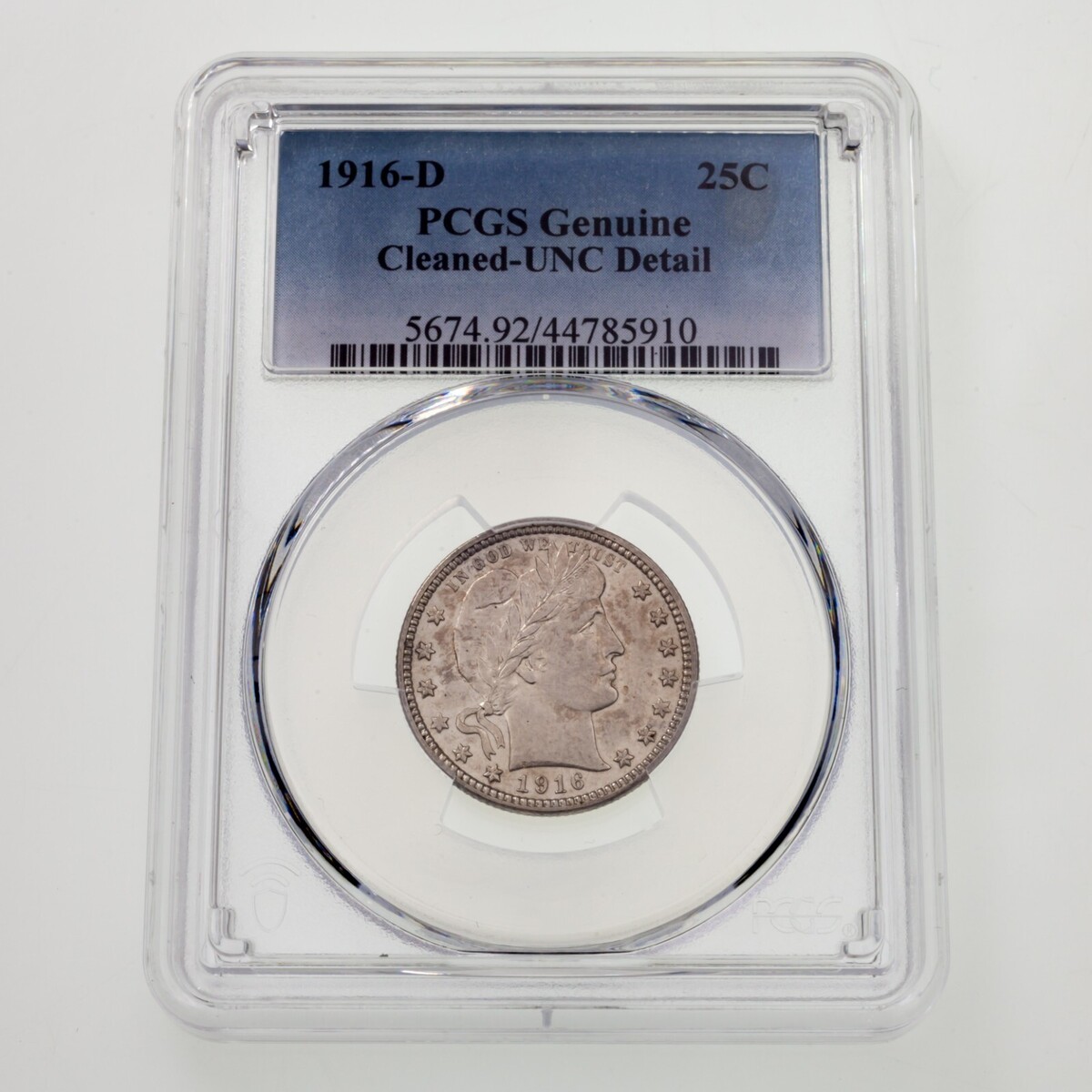 1916-D 25C Barber Quarter Slabbed by PCGS as Genuine Cleaned - UNC Detail. Nice!