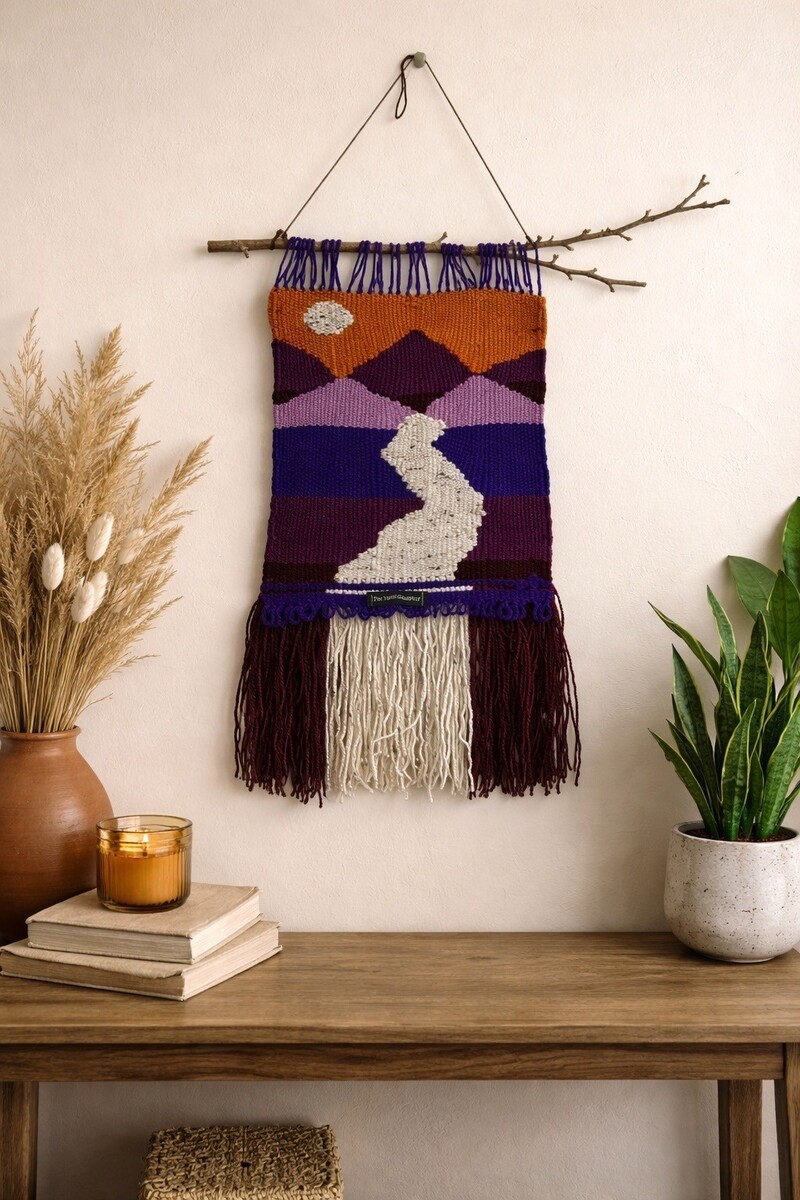 Handwoven fiber art wall hanging by The Yarn Sculptor featuring a scenic mountain landscape with sun and winding river motif. Crafted with richly textured yarn in layered tones of purple, rust, cream, and blue, suspended from a natural twig rod with decorative fringe. A striking handmade textile piece perfect for boho, rustic, cabin, or nature-inspired interiors.