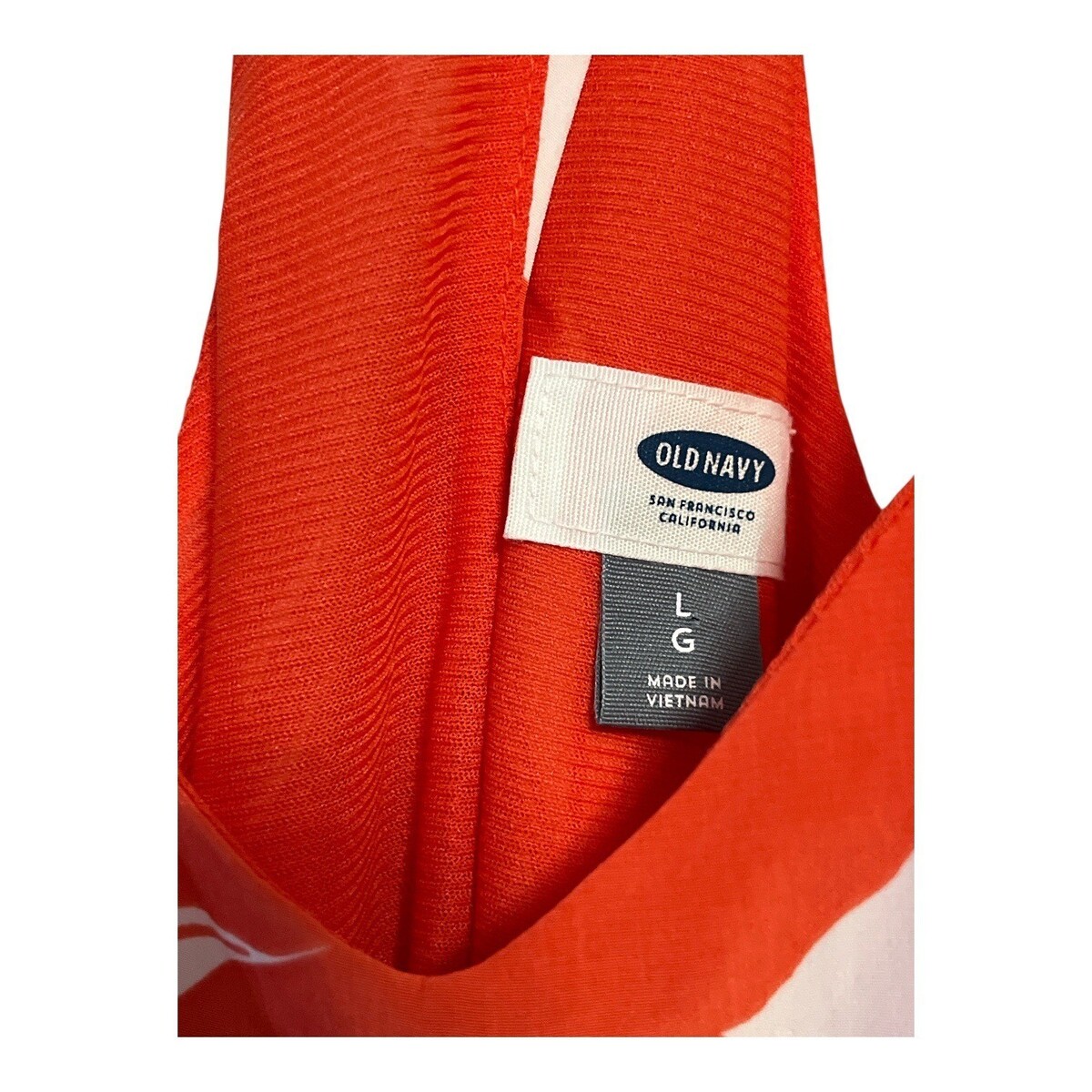 Bright orange Old Navy sleeveless dress featuring a bold white tropical leaf print. Designed with a racerback style and lightweight, flowy fabric that makes it perfect for warm weather, beach trips, or casual summer outings. Easy pull-on style with relaxed fit.