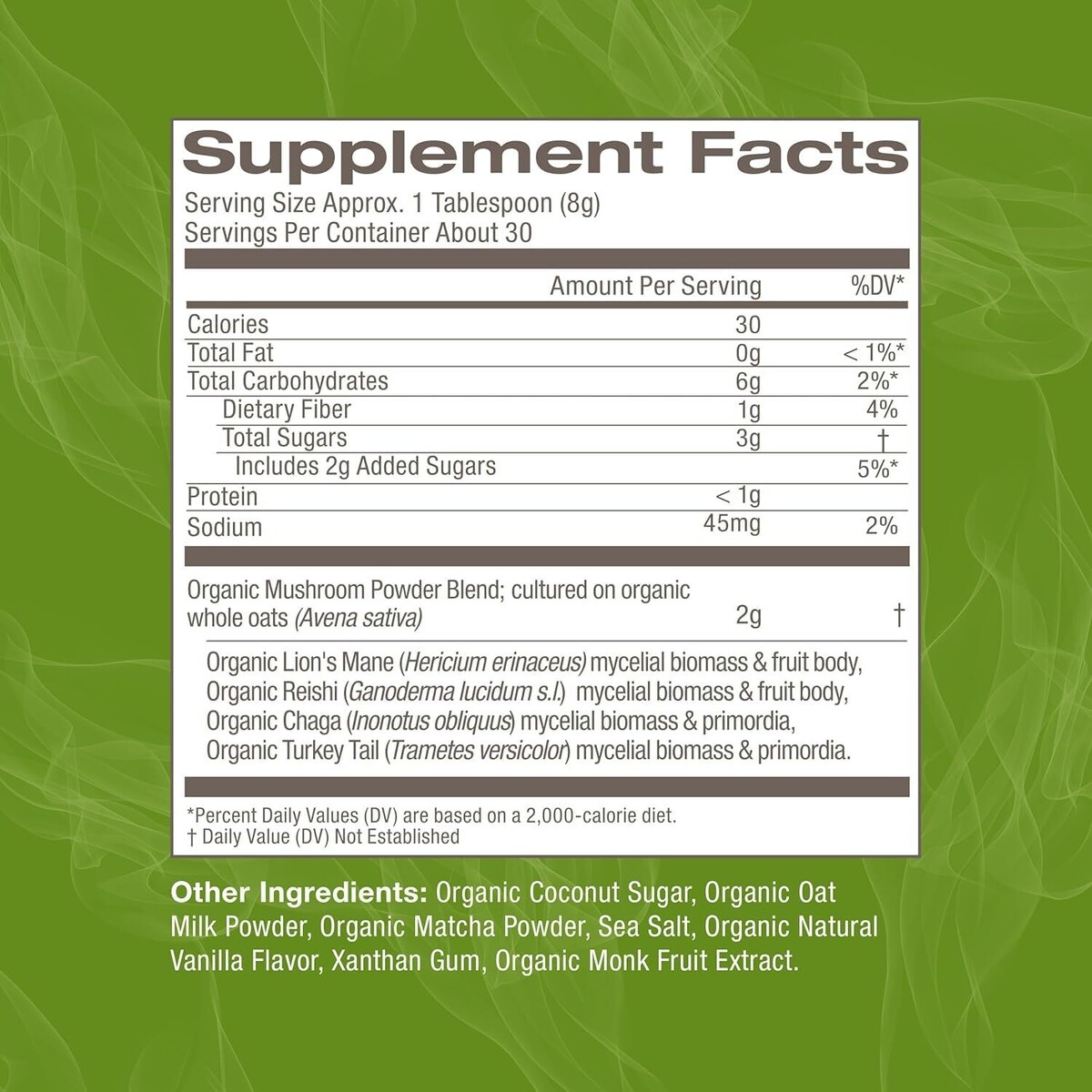 Expiration Date of 5/2026 ? FOCUS AND STRESS SUPPORT - Crafted with Lions Mane, Reishi, Chaga, and Turkey Tail mushrooms blended into Japanese matcha green tea, this latte promotes focus, balance, immune defense, and calm clarity in every sip. ? 2000MG FUNCTIONAL MUSHROOMS ? Each serving delivers 2000mg of organic whole food mushroom powder with 400mg of beta-glucans to naturally strengthen immune health, support resilience, and fuel long-term wellness. ? CREAMY MATCHA LATTE BLEND - A smooth lightly sweetened matcha latte made with oat milk powder for a delicious creamy texture. Enjoy the earthy energizing flavor of Japanese matcha paired with the benefits of functional mushrooms. ? 30 SERVINGS PER CANISTER - Convenient canister provides 30 servings. Easy to scoop and prepare at home, making it a cost effective way to support focus, energy, and immunity every day. ? OM MUSHROOMS: We grow, dry, and mill our mushrooms in Southern California, ensuring every product is proudly USA grown the Om way. Our powders, capsules, beverage mixes, and gummies are USDA Certified Organic, Non GMO, gluten free, vegan, paleo friendly, keto friendly, and kosher. Each batch is third party tested for purity and potency. Explore our line designed to support daily health, focus, clarity, energy, immune defense, and restful sleep.