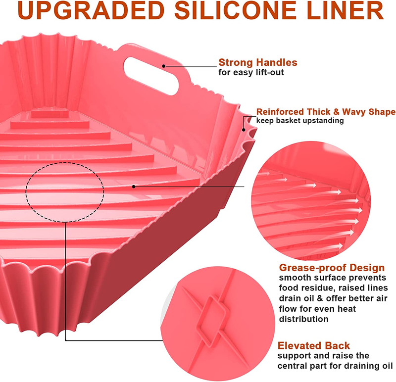 Upgraded Design Air Fryer Accessories - Unlike other common air fryer liner silicone, our liners for air fryer are designed with smooth inner surface to avoid grease and with raised lines at the bottom for even heat distribution, and allow residual oil or grease to flow out easily. So you can enjoy a crispier and healthier meal with our silicone air fryer liner. 2 strong handles on both sides of air fryer silicone liner, easy to lift out and safely store by hanging on hooks.