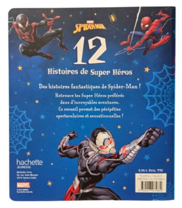 The product is a French language children's book titled "Marvel Spider-Man: 12 Histoires de Super Heros" published by Hachette Livre in 2019. This comic book features Spider-Man as the main character within the Marvel Universe, specifically the MCU. It is a softcover format with a modern age era and falls under the genre of superheroes. The book is aimed at a general audience and contains 12 stories featuring Spider-Man and other Avengers superheroes.