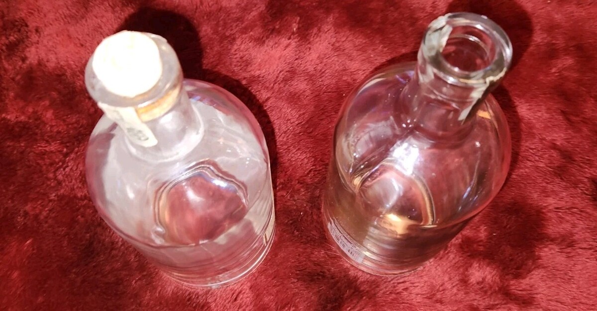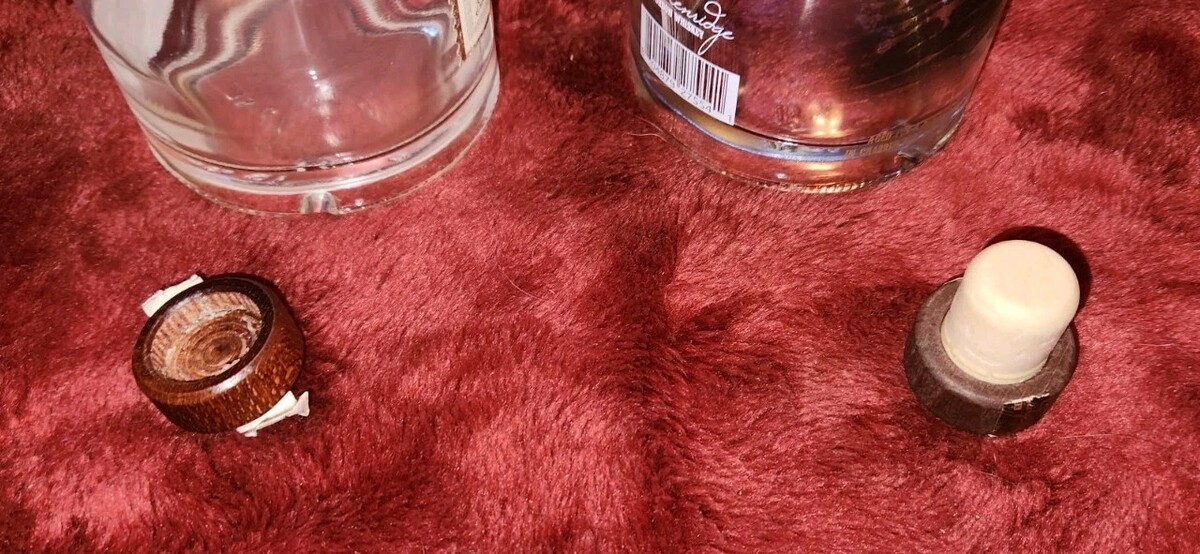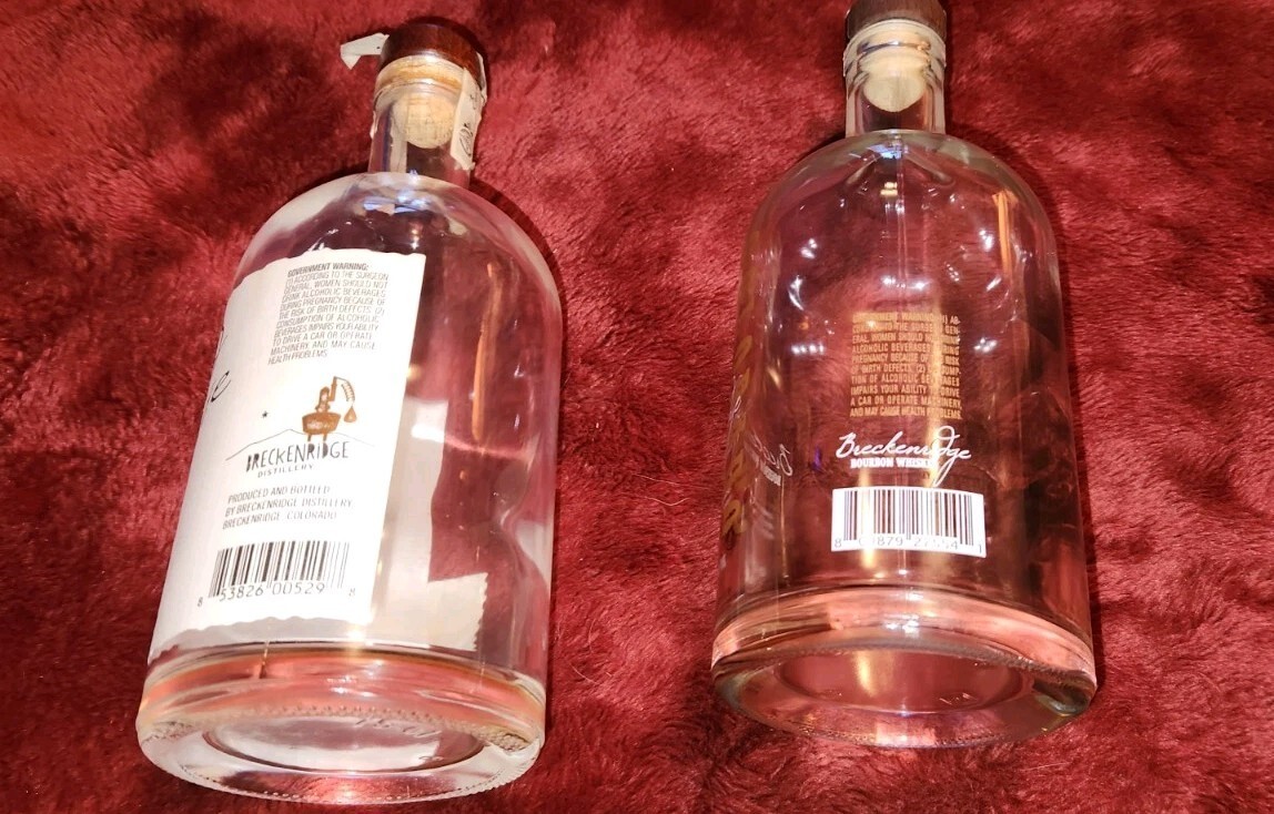 Lot of 2 empty unwashed Brekenridge Whiskey bourbon bottles. Both have corks. One is loose from the top and stuck in the bottle.