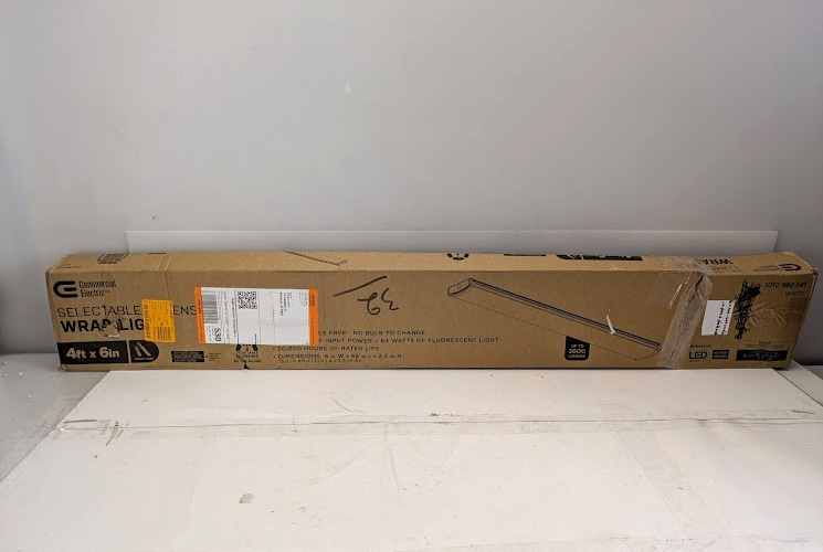 Upgrade your lighting with the Commercial Electric 4ft. x 6in. Selectable Lumens LED Wrap Light is engineered for powerful, energy-efficient performance in a sleek, flush mount design. Ideal for replacing outdated fluorescent lights, customize this LED wraparound light with three selectable lumens of brightness and three adjustable color temperatures: 3500K Neutral White, 4000K Bright White, and 5000K Daylight to suit your lighting ambiance for any environment. Built with durable metal housing, the frosted lens surrounds the LEDs distributing light widely while reducing glare for more comfortable, uniform illumination. This versatile fixture is optimal for both residential and commercial spaces such as offices, utility rooms, basements, garages, hallways, stairwells, and laundry rooms. Designed for maintenance-free operation with no bulbs required, this long-lasting fixture is a smart, cost-effective upgrade for any interior lighting application.