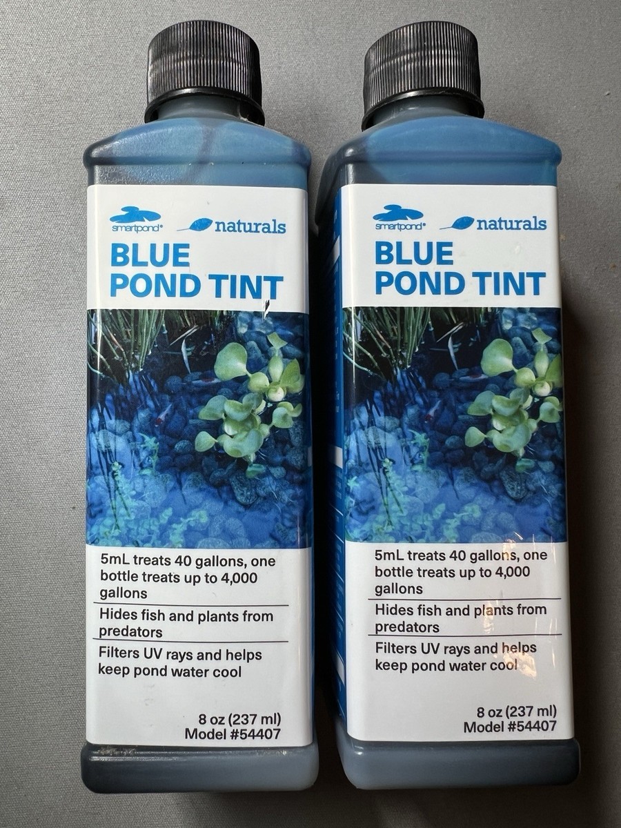 Blue Pond Tint, Smartpond naturals, 8oz.. Hides fish and plants from predators. Filters UV rays and helps keep pond water cool. 5mL treats 40 gallons, one bottle treats up to 4,000 gallons.