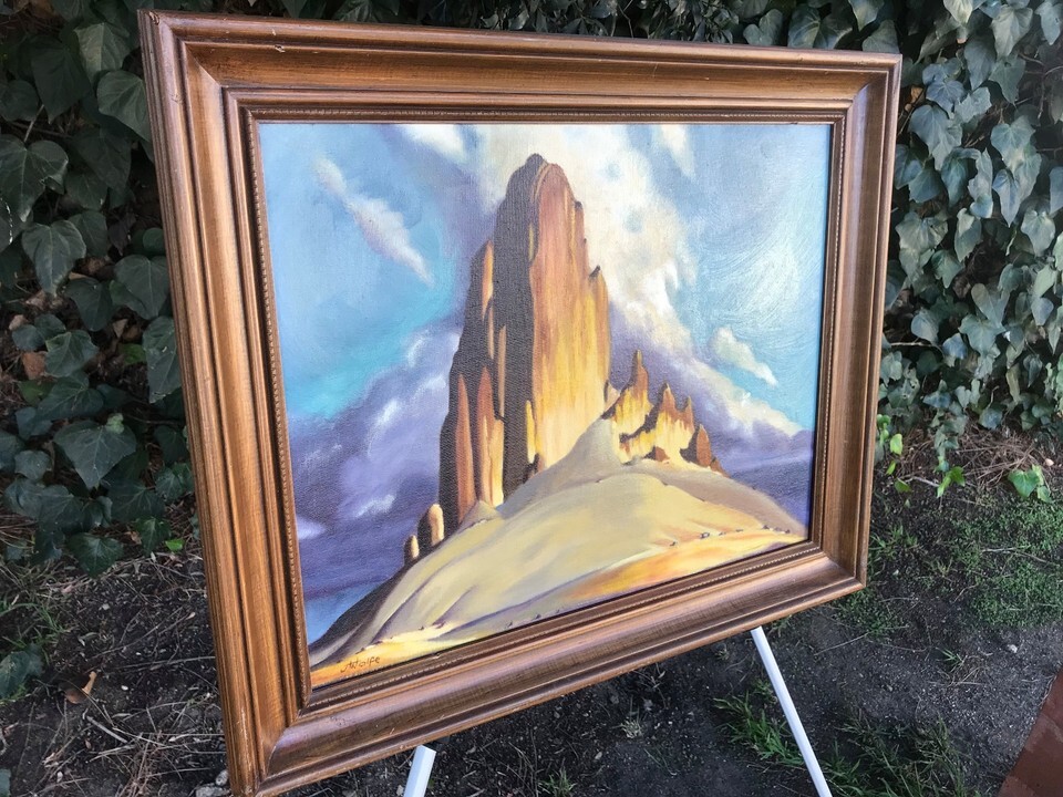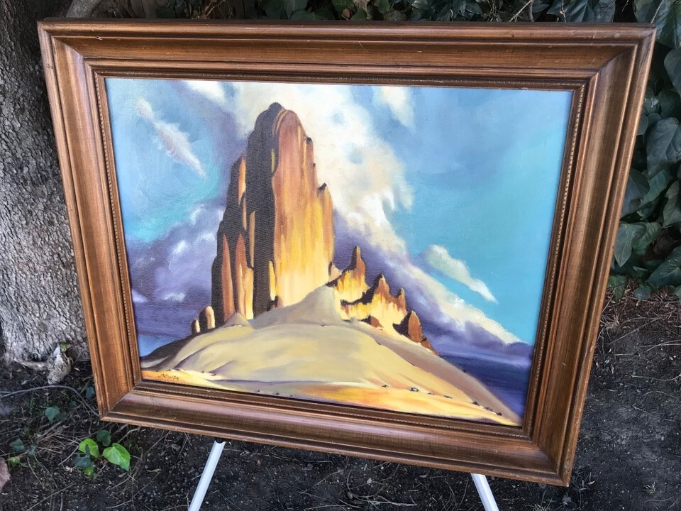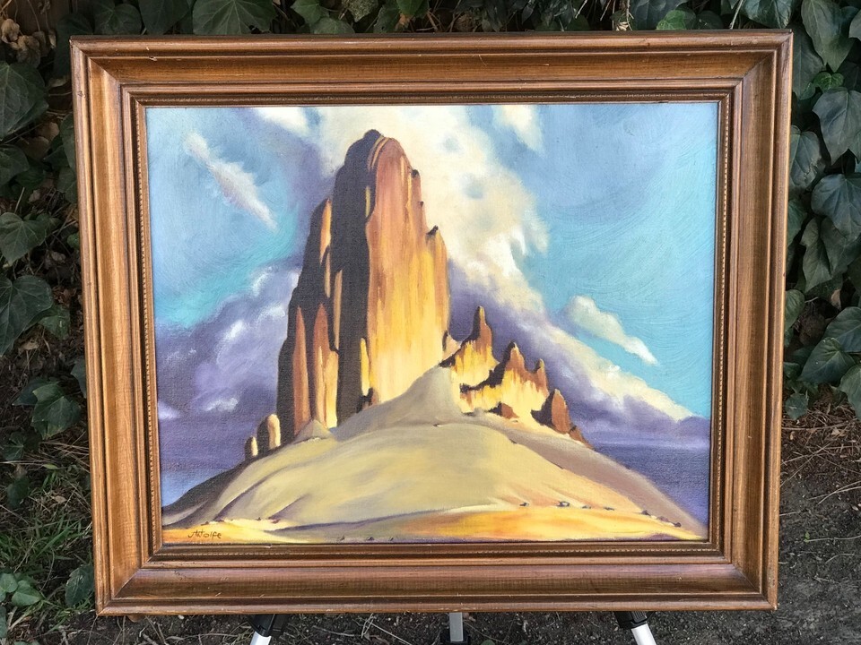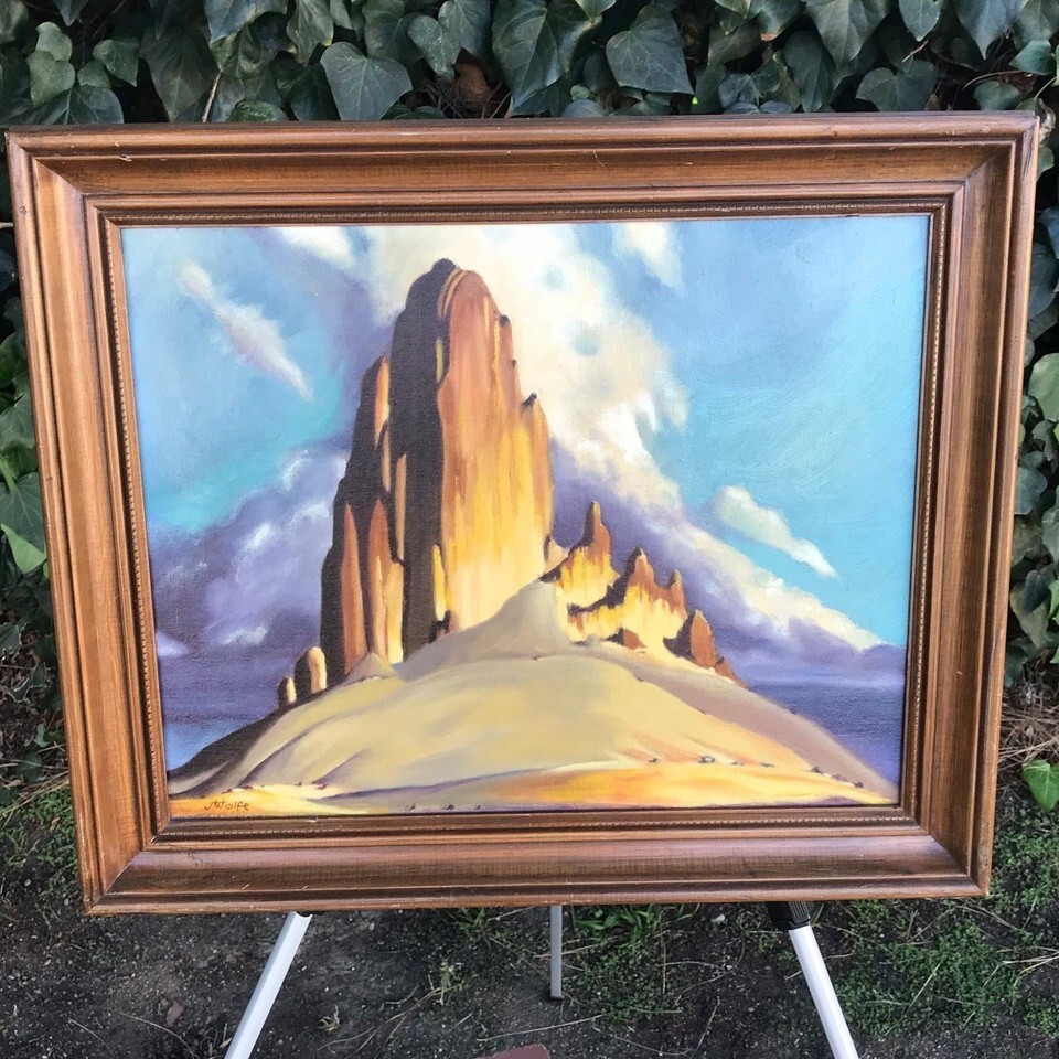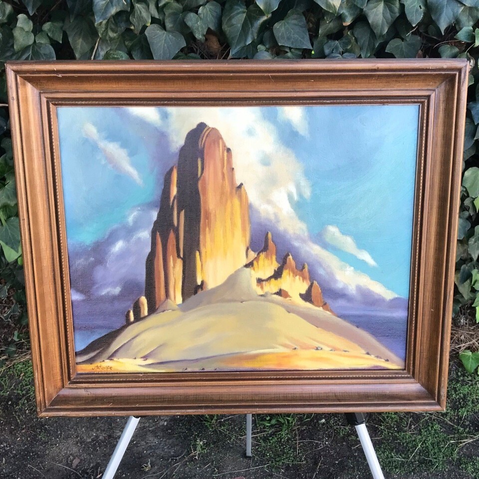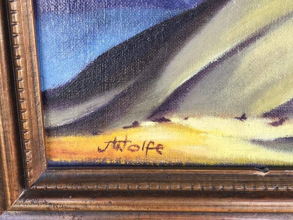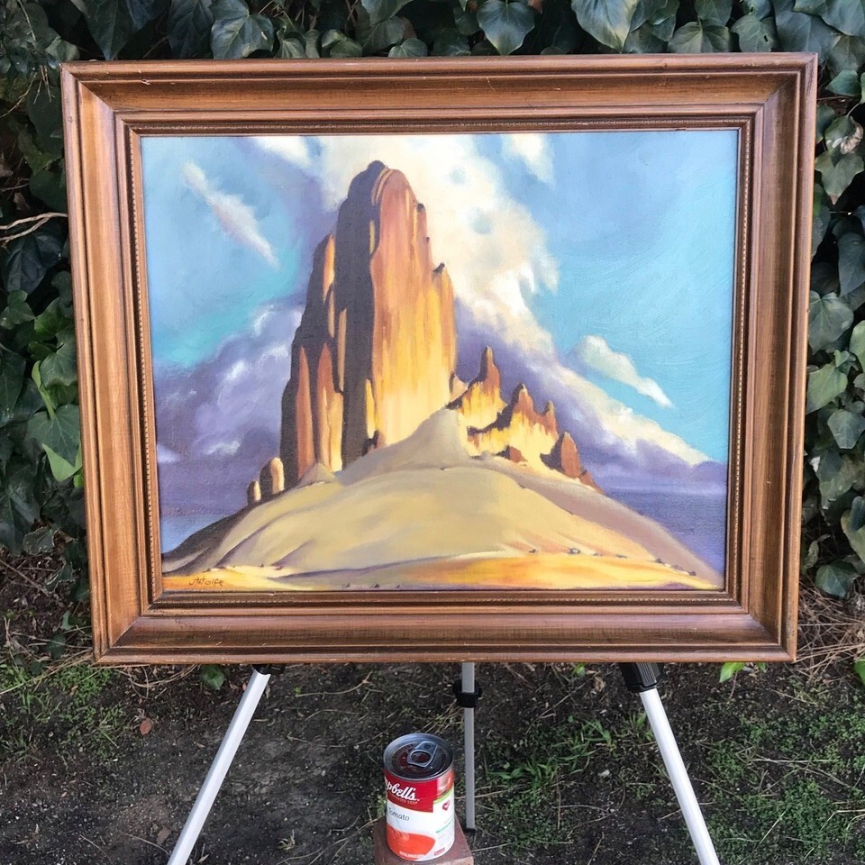 J WOLFE Original 1950s MODERN DESERT LANDSCAPE PLEIN AIR VINTAGE OIL on BOARD