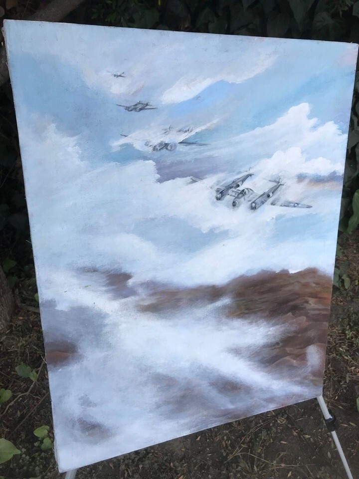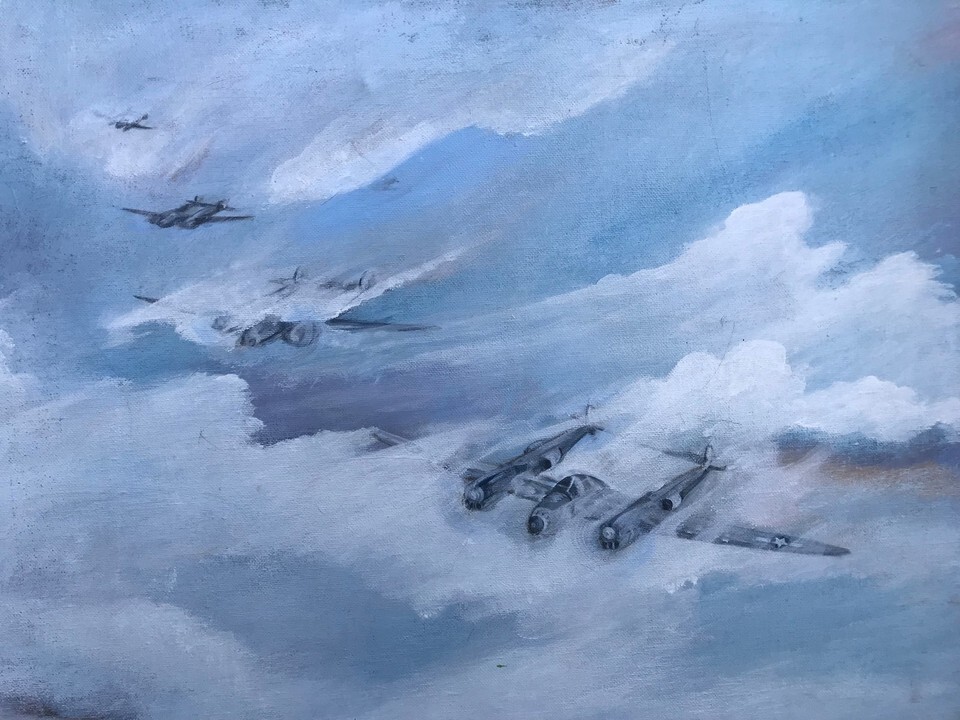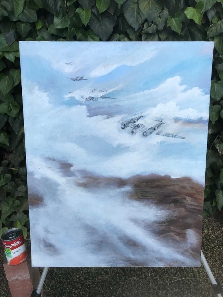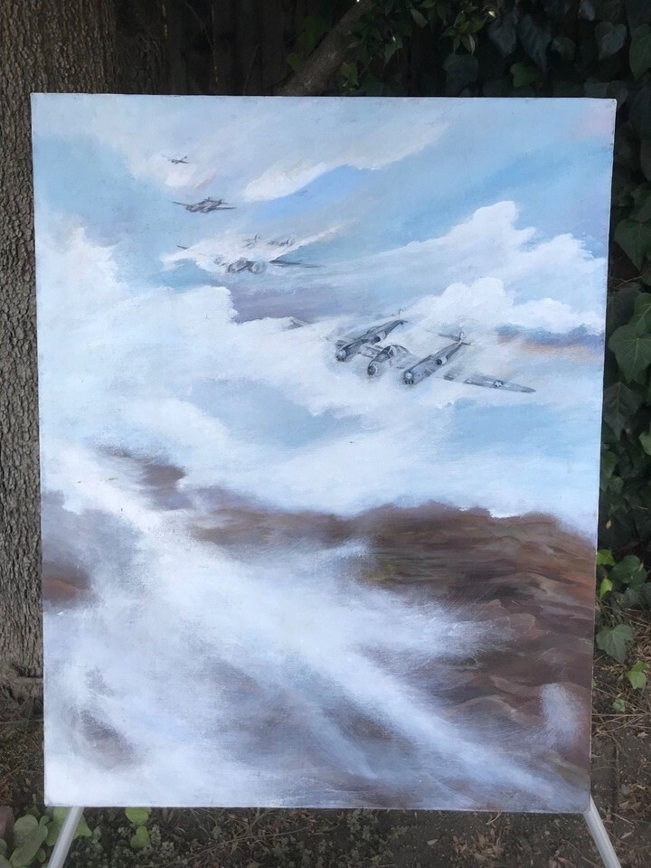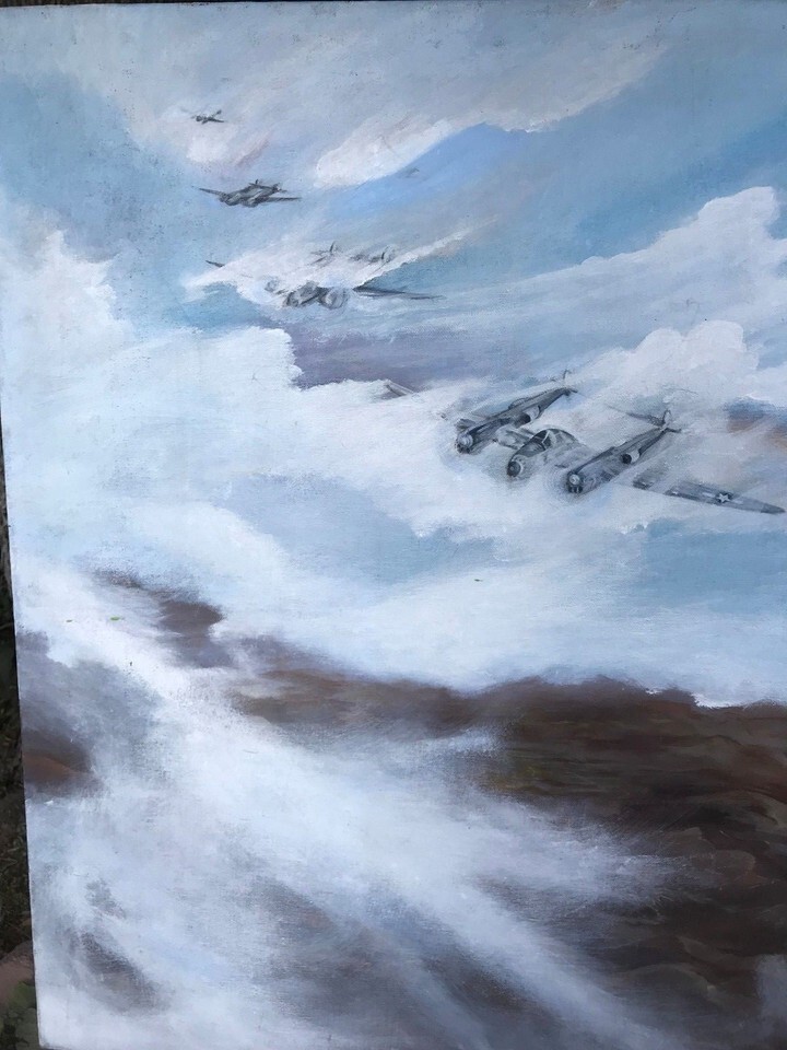 Depicted the famous WW2 US Air Force P38 "Lightning" Aircraft piercing the cloud cover.