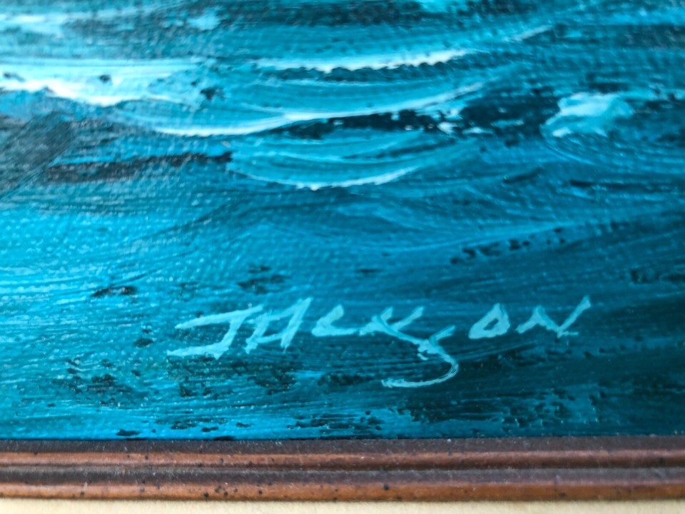 HEWITT JACKSON Original FRIGATE SAILING SHIP 1970s SEASCAPE SIGNED OIL ON CANVAS