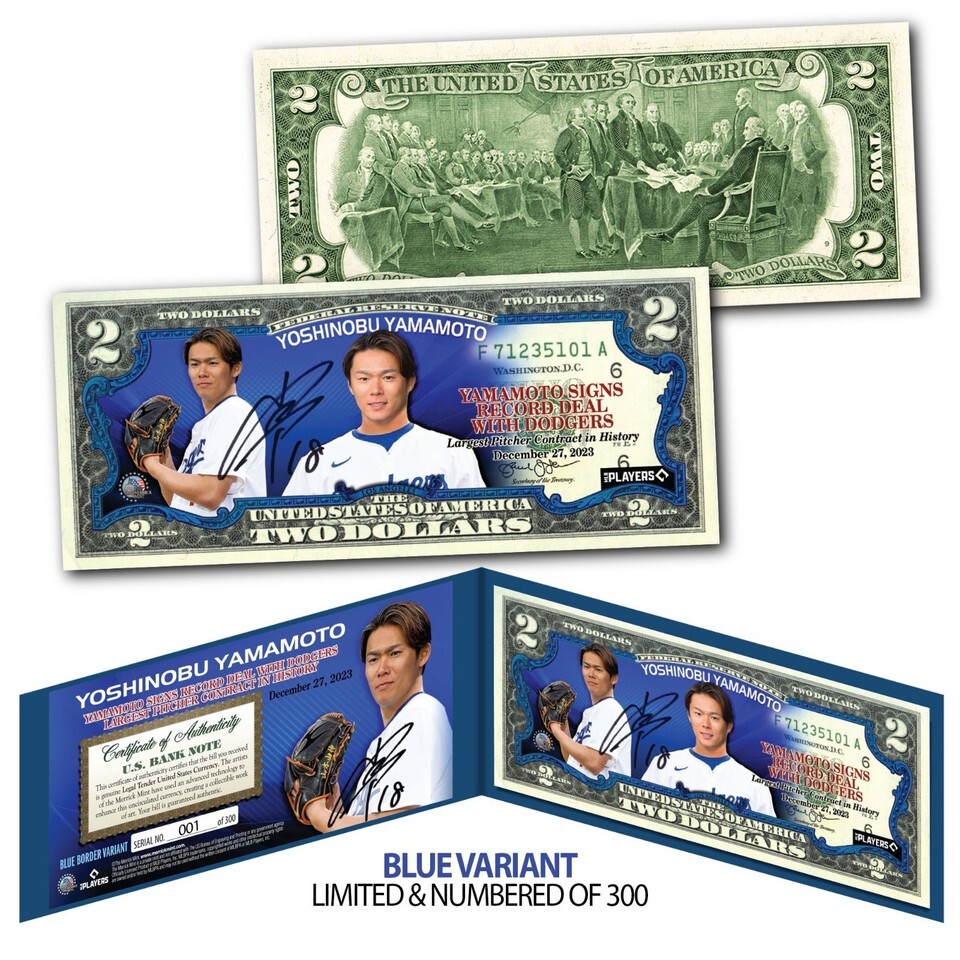 Celebrate Yoshinobu Yamamoto, who signed the largest pitcher contract in baseball history, with this officially licensed $2 bill. This Blue Border Scroll Variant is limited numbered (#/300)?only these variants feature the Dodgers blue scroll outline?and comes with a numbered Certificate of Authenticity. Each bill is genuine uncirculated U.S. $2 legal tender with stunning full-color artwork.