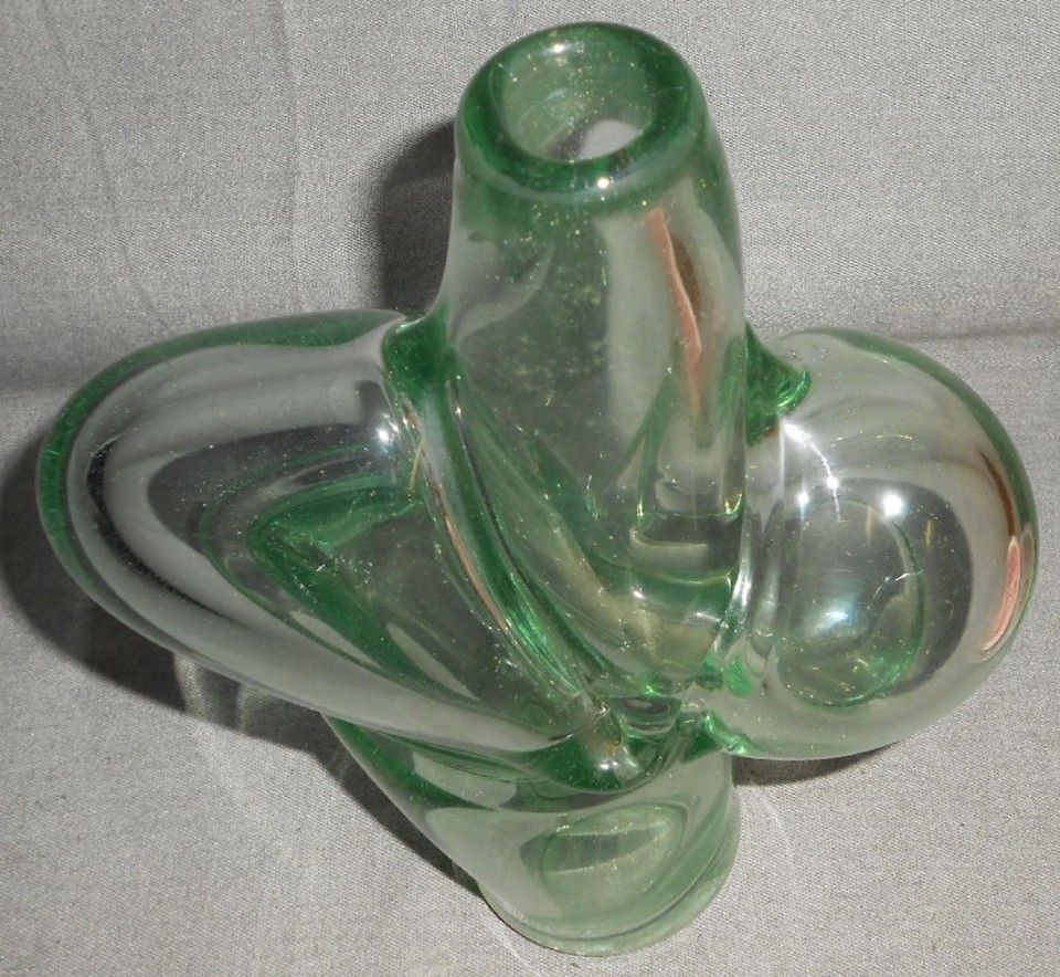 This is a great Mid Century Studio Glass Vase that looks like an abstract torso from Noted Artist Dr Robert Fritz who was a major player in the American Mid 20th Century Studio Glass Movement and who formed one of the first Glass Art Departments at San Jose State where he taught in the Mid 60s. This signature was used from the 1960s-80s. His work has many famous/noted collectors and is also in the Smithsonian American Art Museum. This vase measures approx 11 1/4" tall x 8 1/2" wide and it is in good pre-owned condition with no chips or cracks. There is one glass bubble and also some film/condensation near top of vase on the inside. Please see photos for best description up close. Displays beautifully!