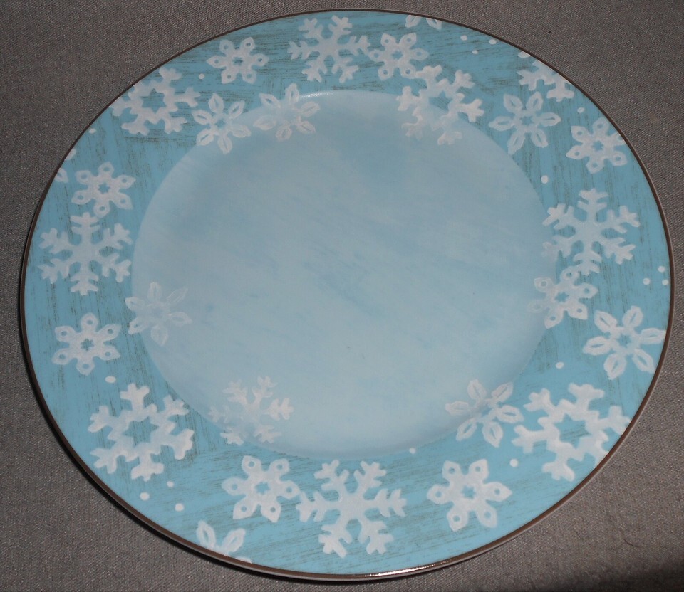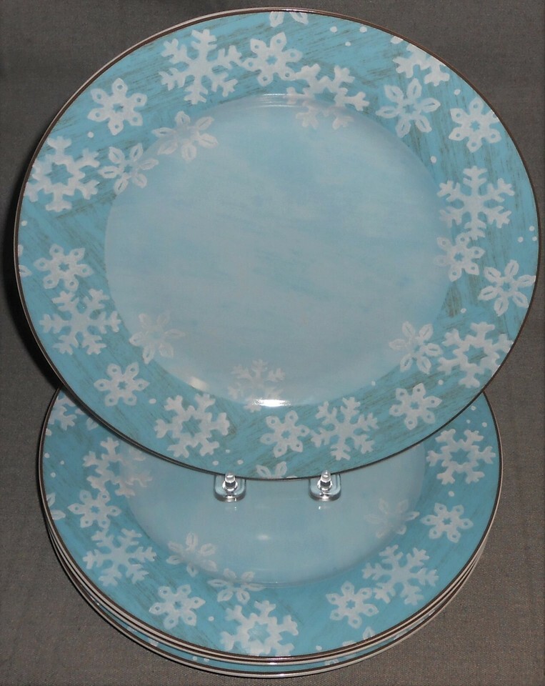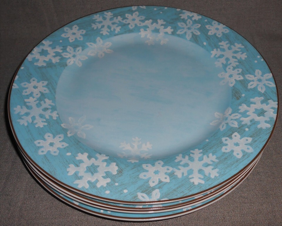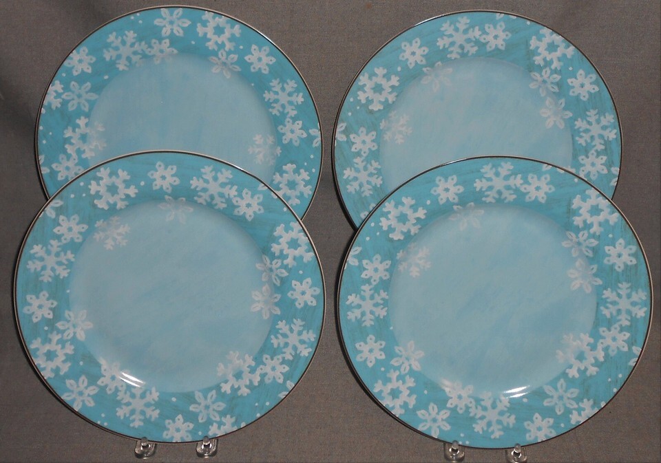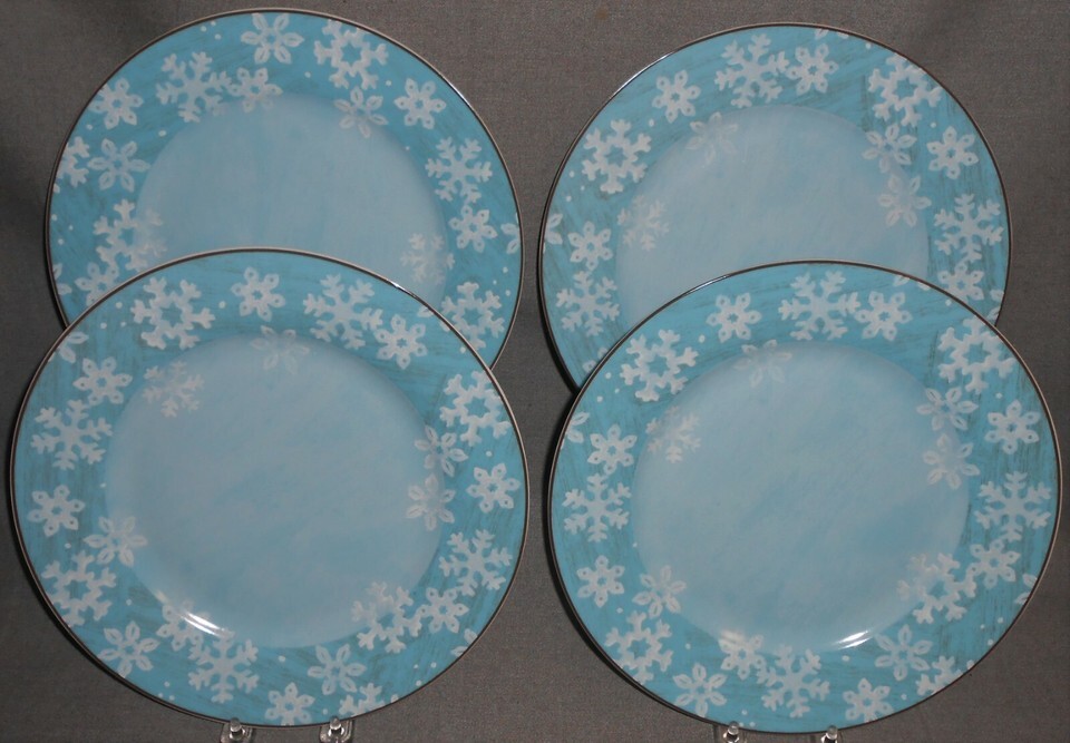 This is a set of (4) 11" Dinner Plates in the Christmas/Holiday Evergreen Ernie Pattern with a Snowflake Motif. All four plates are in good pre-owned condition with no chips or cracks.