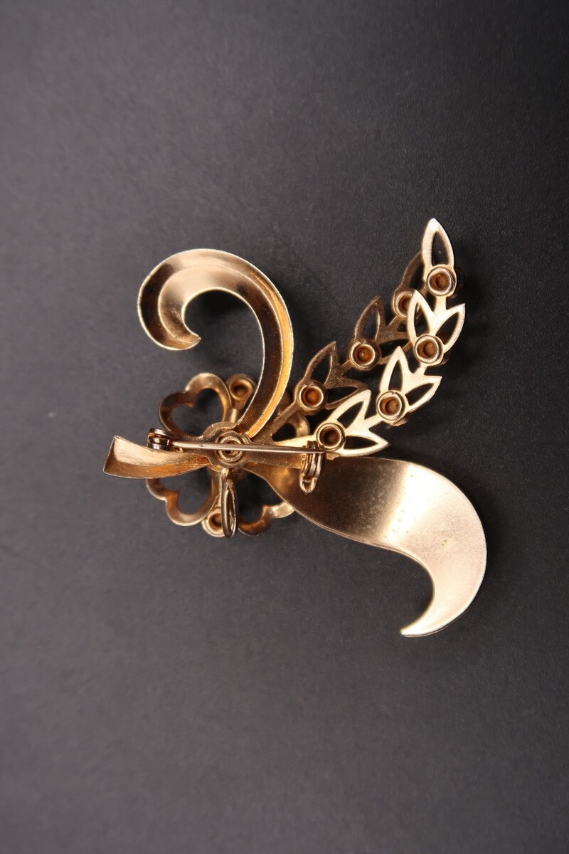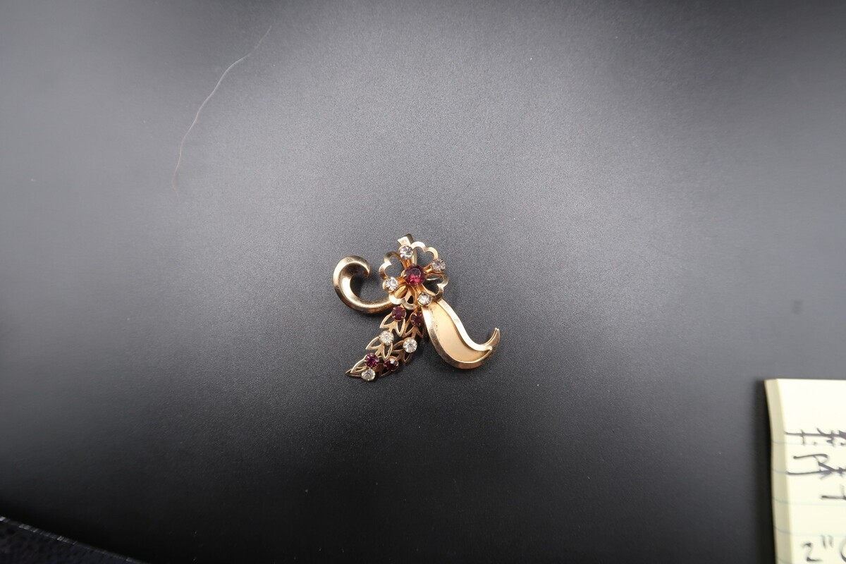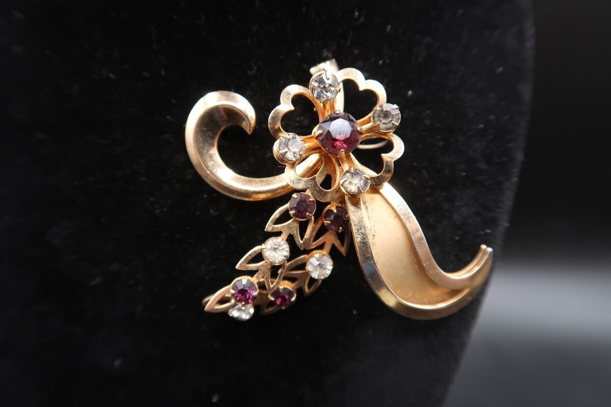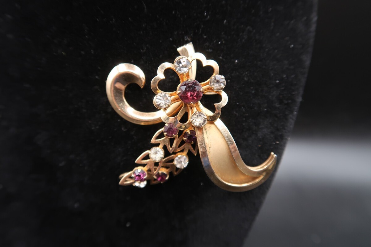 Vtg Gold Tone Floral Brooch Purple & Clear Rhinestone Accents Retro Mid-Century