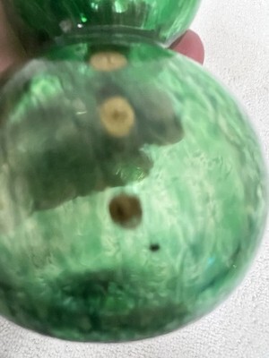 Heavy Hand Blown Art Glass Green Crystal Snowman Red Hat Figurine 5 3/4" Tall. Heavy glass green snowman figure red hat, gold eyes, mouth, buttons, orange carrot nose measures approx. 5 3/4" tall red hat ornate curved potentially an ornament but really heavy. No damage, gold accents great condition. See pictures.