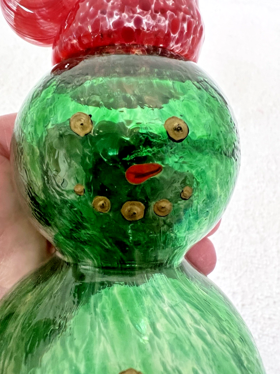 Heavy Hand Blown Art Glass Green Crystal Snowman Red Hat Figurine 5 3/4" Tall