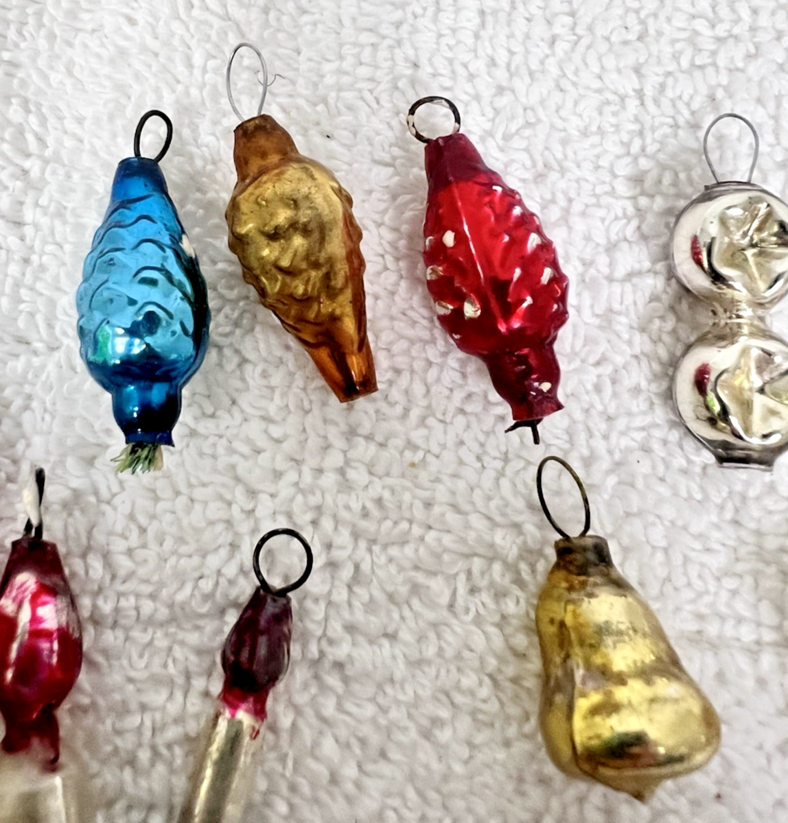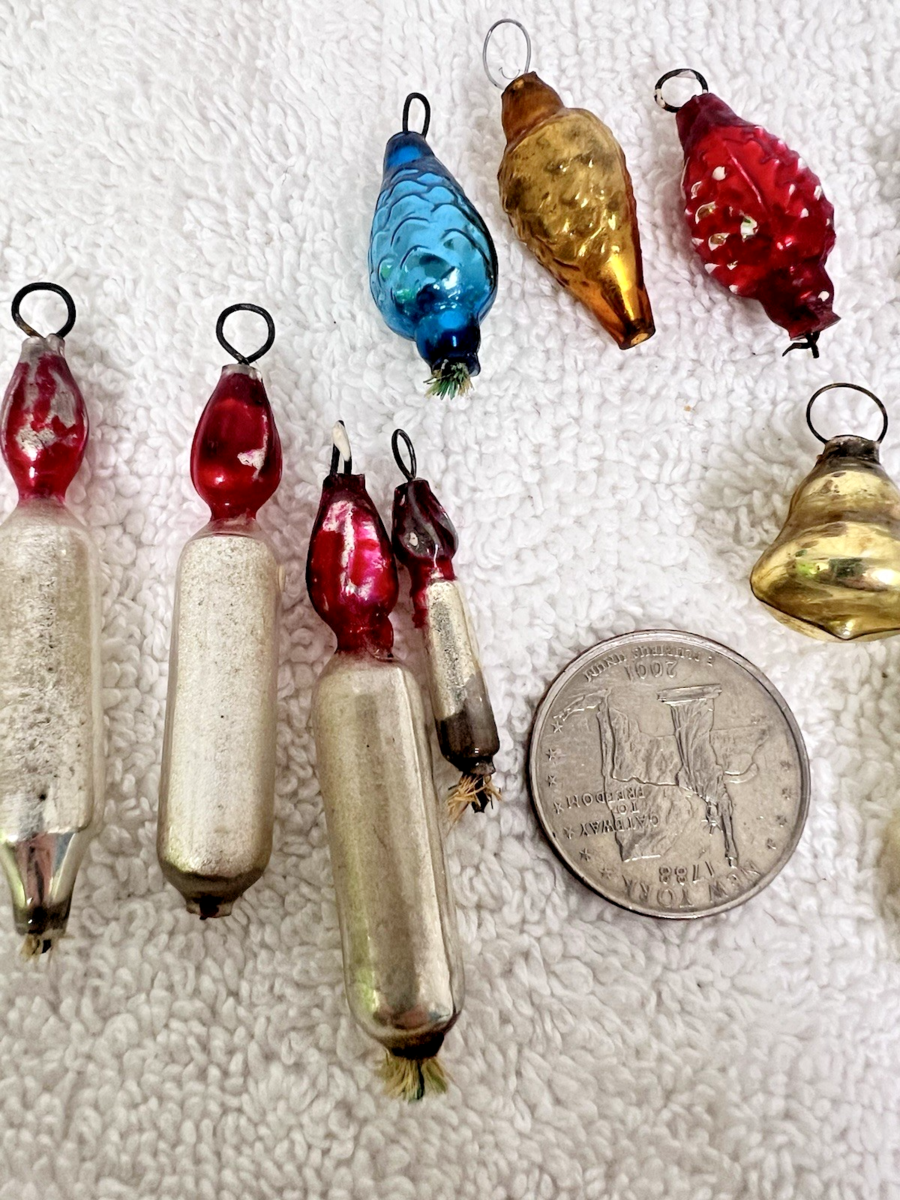 10 Antique Vintage Miniature Small Mercury Glass Christmas Ornaments Star 4 Candles 3 Pinecones 1 Bell and 1 Teardrop double ornament. Overall, all ornaments are in good used condition. Small candle measures approx. 1" long, larger candles measure approx. 2" long, silver star measures approx. 1 1/2" long and 1" wide, pinecones measure approx. 1" long, gold bell measures approx. 3/4" long, the silver double drop ornament measures approx. 1" long. Some wear to paint coloring on a few of the mini glass ornaments, no breaks or damage I find. See pictures.
