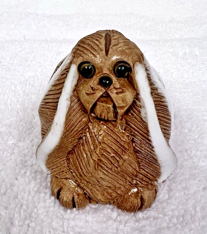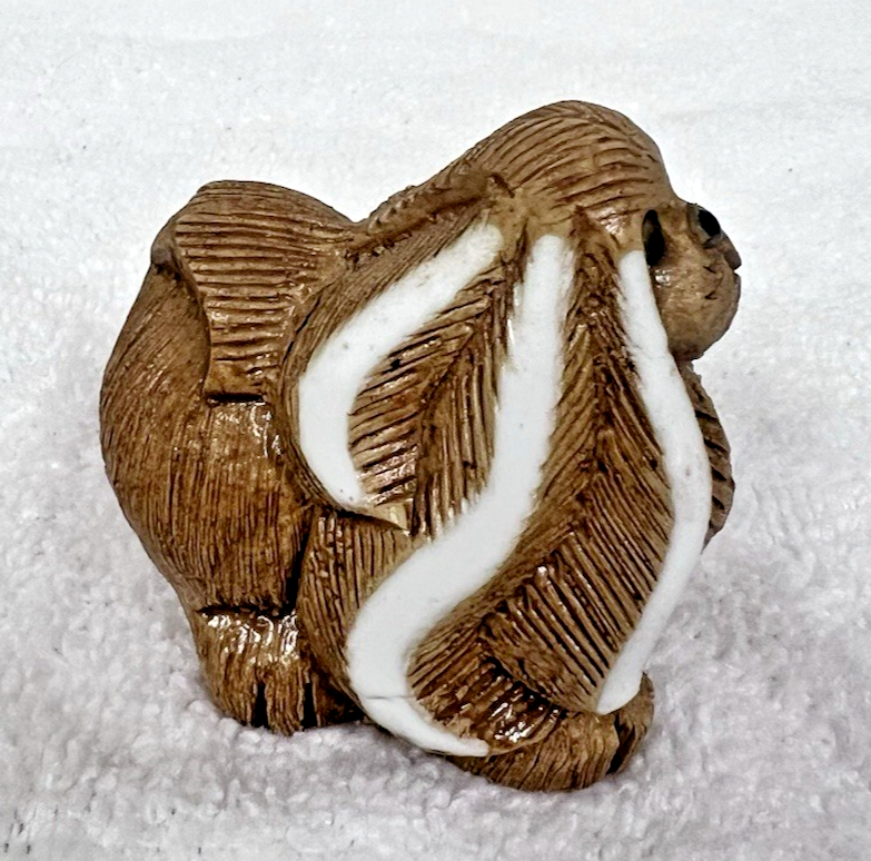 Artisania Rinconada Uruguay Carved Clay Pekinese Dog Figurine 2 3/4" Tall. Brown carved clay with white ear accent Pekinese dog figurine measures approx. 2 3/4" tall, 2" long and 1 3/4" wide, no damage to carved clay figure, eyes nose ears great condition, signed on bottom. See pictures.