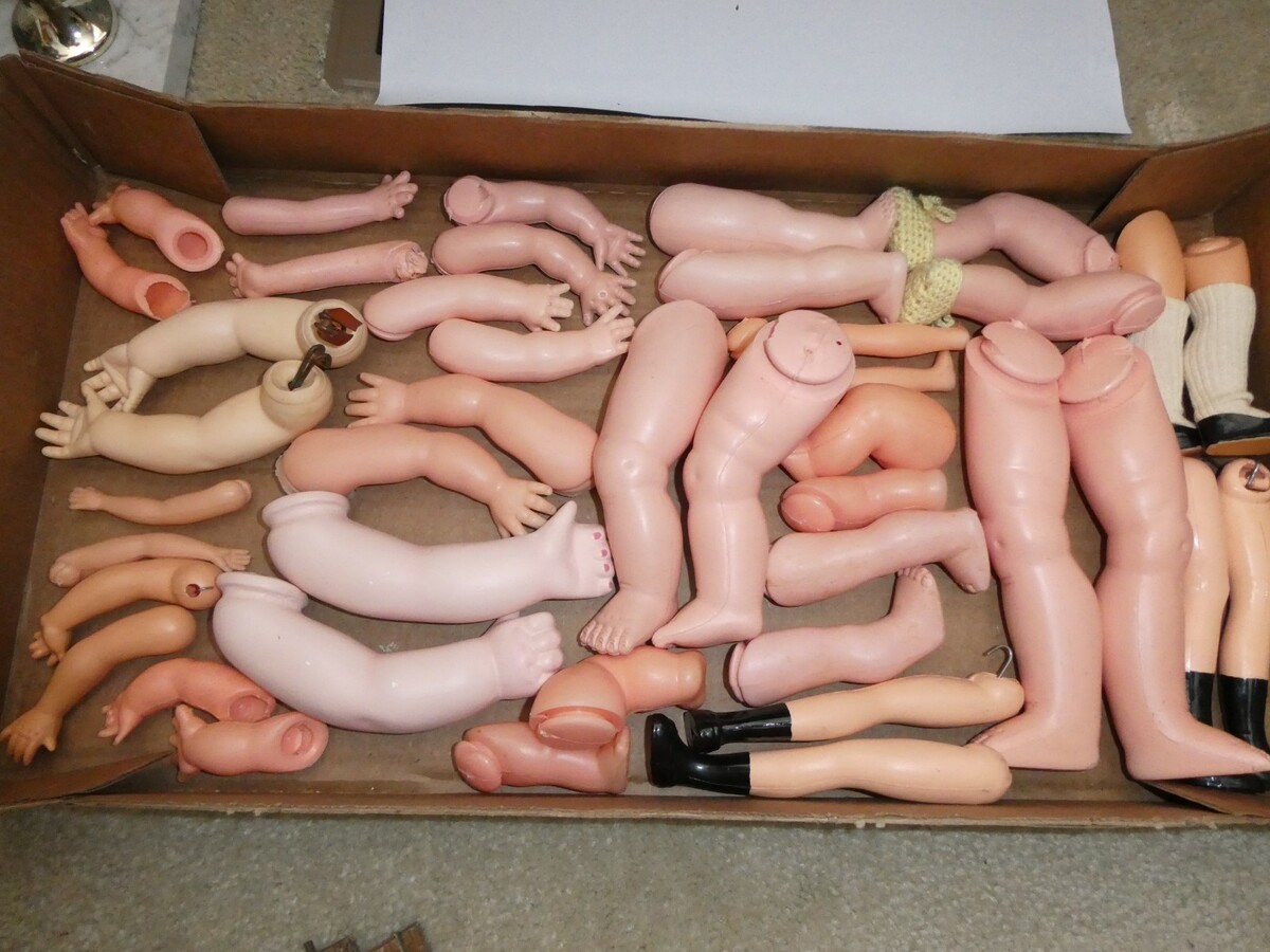 Very nice, vintage large lot of pairs of circa 1960s to 1970s era, plastic and vinyl girl doll legs and arms in the picture. Legs are mostly from 3 to 8 inches long. Nice shape, light use, almost all are pairs, maybe could use a little fine cleaning. Zoom in for details.