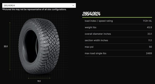 Tires are 33" overall diameter. Your truck may require a level or a lift to fit this size tire.