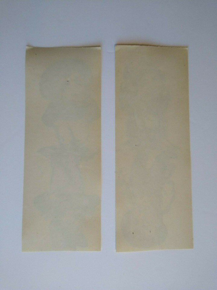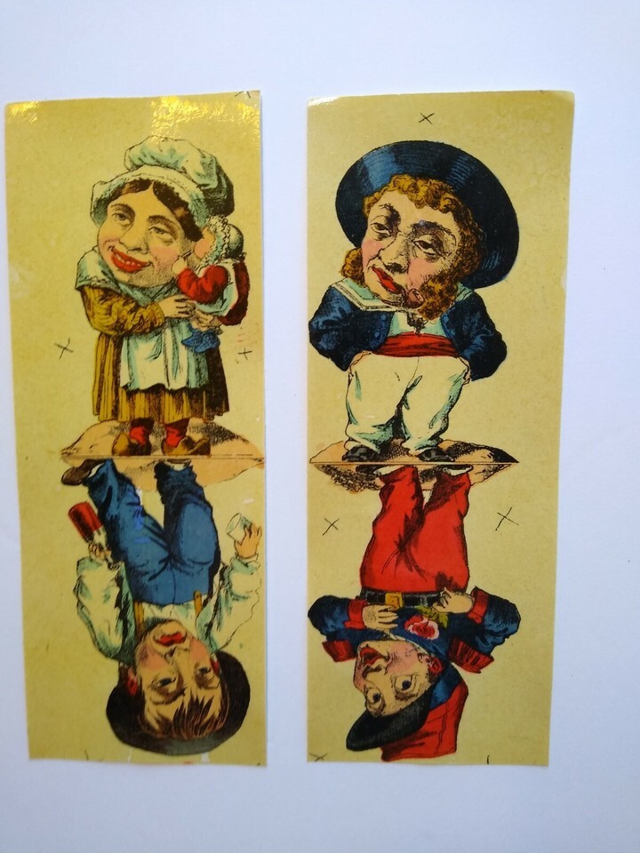 Vintage French circa 1910's comical game art prints. There were to be used for actual games but are left over stock. There are two sheets with two characters on them as shown. Nice shape but there is a small pin hole to one character and some paint wear. Size is 7.25 x 2.75.