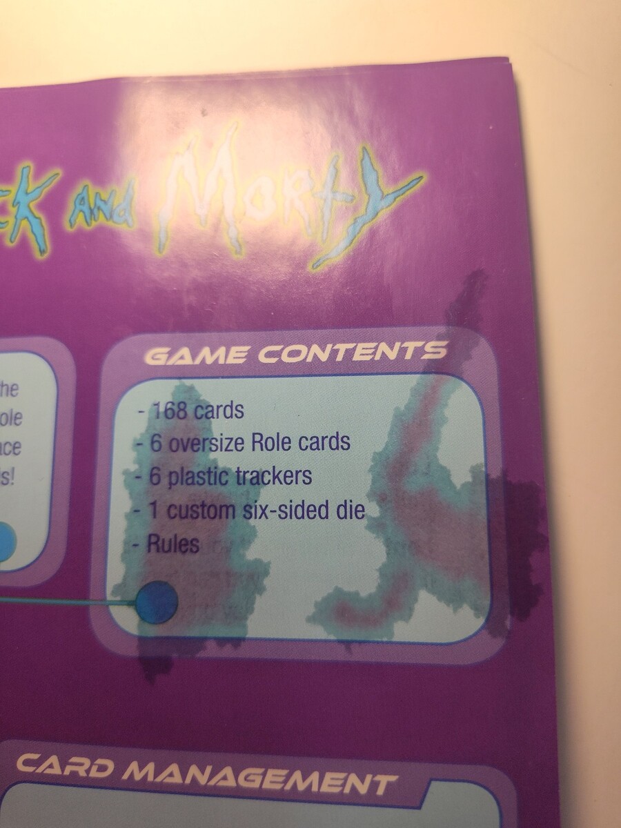 The Morty card (double-sided) has a small stain/splotch on one side only.