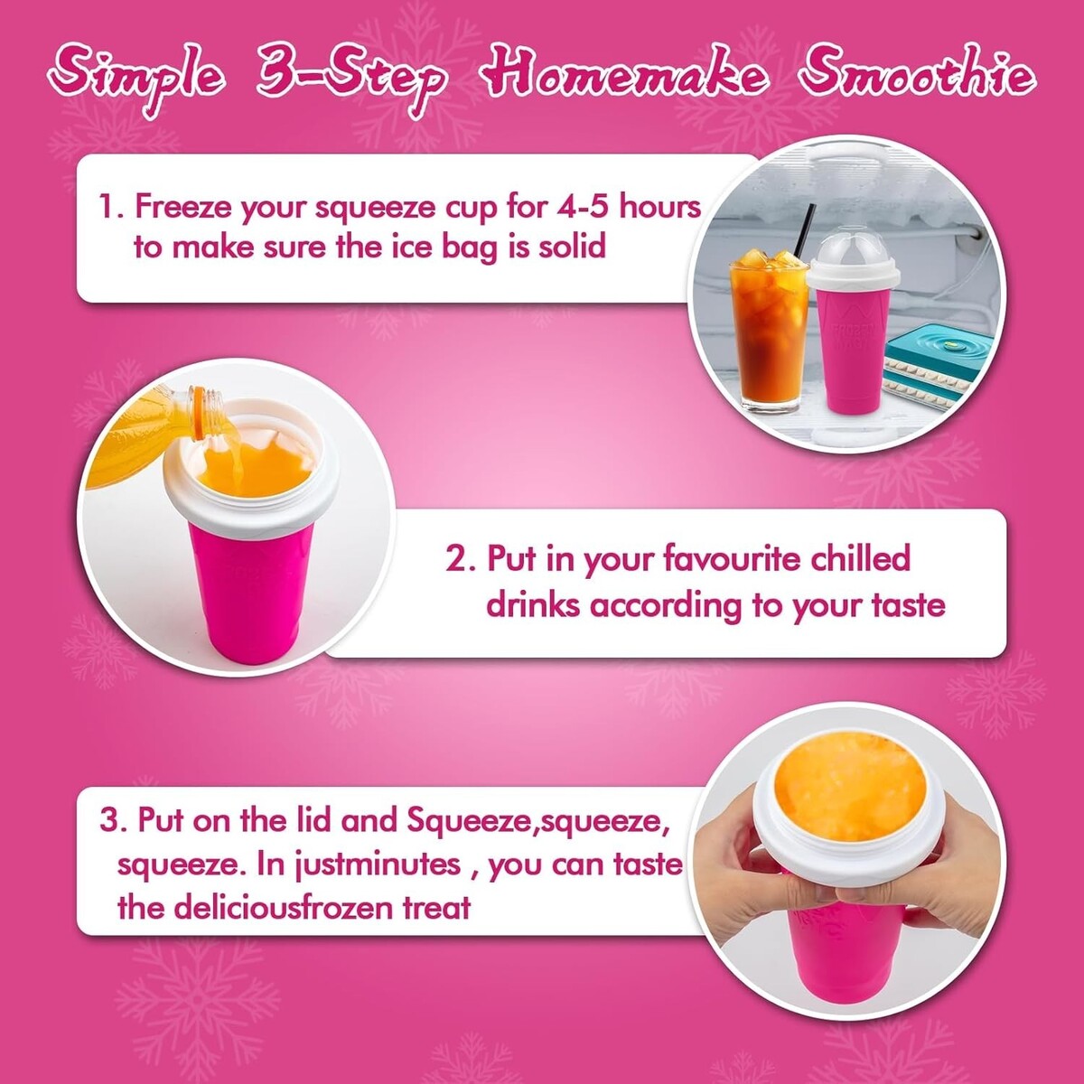 Immersive DIY Experience: Simply freeze the cup for 4-5 hours, pour in any beverage of your choice, close the lid, and squeeze for 1-2 minutes to create a delightful smoothie.