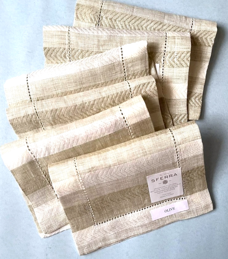 Sferra Ascot Olive Cocktail Napkins Herringbone Stripe Set/6 Pure Linen 6x9 New