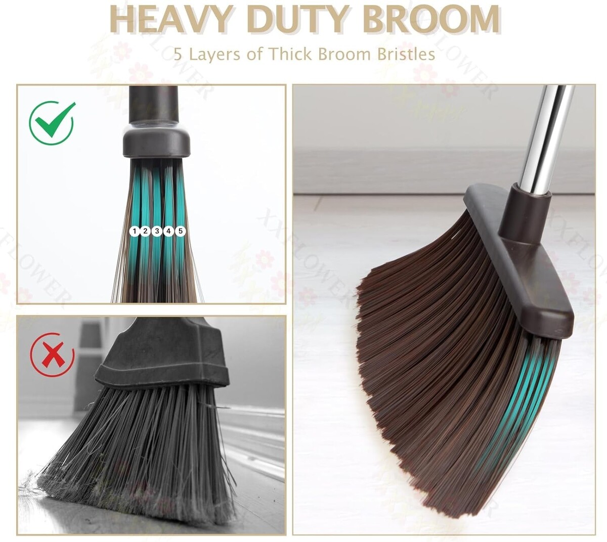 5-Layer Bristles: Enhanced durability with thicker bristles prolongs the life of the broom. The wide 11.8-inch broom head ensures efficient sweeping in large areas.