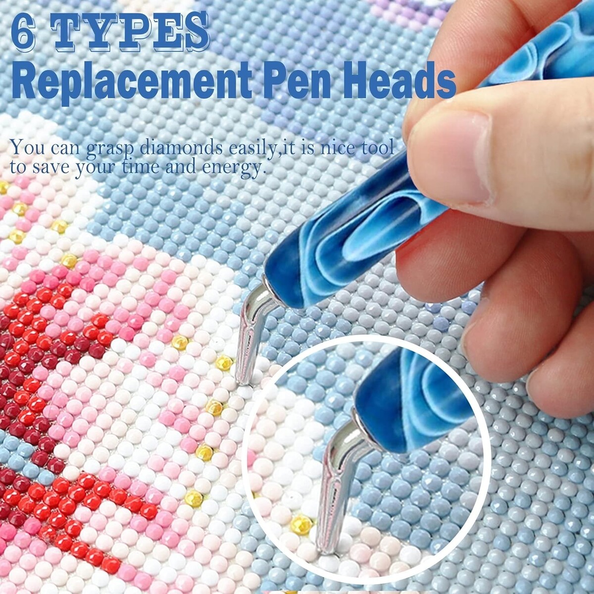 Includes a comprehensive set of 5D Diamond Art Accessories: 1 resin pen, 6 metal replacement pen heads (including 1 metal tip, 1 elbow pen tip, 1 pcs 3/6/9-drills bit, and 1 corrective pen tip), 6 glue clays, and 1 drill tip storage box.