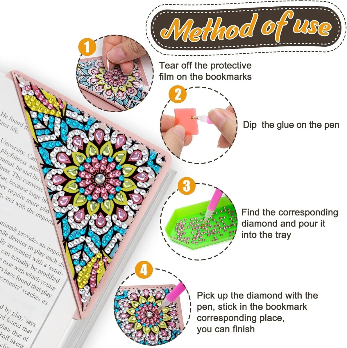 Easy to Use: Each bookmark features unique designs. Simply peel off the protective film, pour the corresponding diamond gems into the tray, apply glue to the pen, and place the gems onto the bookmark for stunning results.