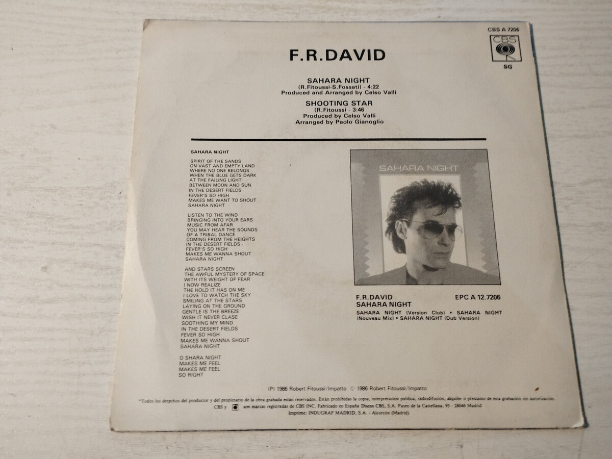 F. R. David Sahara Night 1986 CBS - Single LP vinyl 7 " VG/VG Promo