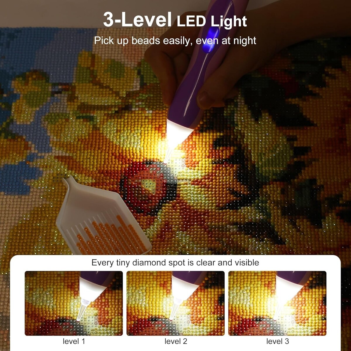 Lighted Diamond Art Pen: Built-in LED light with 3 adjustable brightness levels to illuminate your workspace, reducing shadows and eye strain.