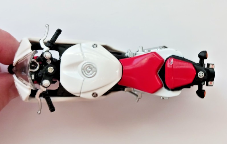This is a 1:18 Scale (4 1/2" inches long) Yamaha YZF-R6 Motorcycle sport bike from Maisto. It's made of diecast metal and plastic, with rubber tires. It has a little wear on it, but not much, and there are some nice details like the disk brakes, turn signals and the moving rear suspension. It does have it's kickstand as well. It's a really futuristic-looking Yamaha street bike, and is also pretty hard to find!